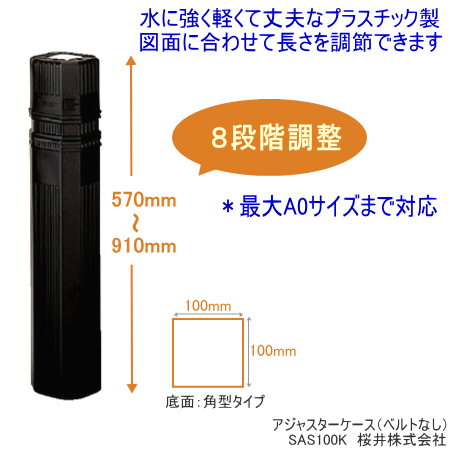 図面にあわせて長さを調節できる。8段階で伸縮自在の図面ケース 水に強く軽くて丈夫なプラスチック製。ポスターや図面の持ち運びや長期保存に最適。 商品名 アジャスターケース 角型 ベルトなし 品番 SAS100K ブラック サイズ 内寸100×100mm、長さ:570〜910mm 仕様 8段調整 ベルトなし 四角筒タイプ 材質 硬質ポリエチレン メーカー 桜井株式会社 ※他のモール及び店頭売りと在庫を併用しておりますのでご注文後でも在庫切れの場合がございますのであらかじめご了承下さい。 【関連商品】 図面ケース A1、A0対応 アジャスターケース 販売価格 2,205円 (税込) 図面ケース A1、A0対応 アジャスターケース 販売価格 2,940円 (税込) 図面ケース A1、A0対応 アジャスターケース 販売価格 2,205円 (税込) 図面ケース A1、A0対応 アジャスターケース 販売価格 2,940円 (税込) アジャスターケース ベルト 図面ケースバンド 販売価格 1,260円 (税込) ノックス カードサイズスタイル テンプレート 販売価格 483円 (税込) IDeo IDカードホルダー 吊り下げ名札 販売価格 1,512円 (税込) ぺんてる 多機能ペン ビクーニャEX 販売価格 1,050円 (税込) ペン立てになる筆箱 販売価格 1,050円 (税込)