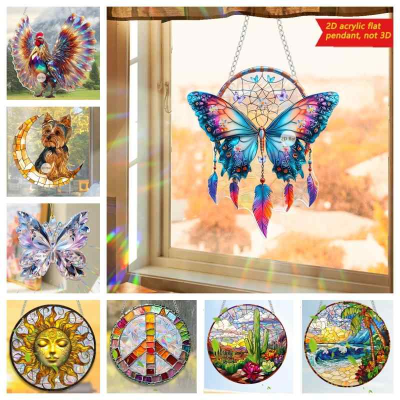サンキャッチャー アクリル製 カラフル 蝶 チョウ 子犬 動物 丸型 カラーフィルム 吊り下げ オーナメント 車内装飾 窓辺 インテリア おしゃれ かわいい ナチュラル