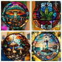 ウォールデコレーション ステンドグラス風 アクリル製 遮光 レトロ ヴィンテージ おしゃれ 灯台 きのこ クローバー 窓 壁掛け 玄関 インテリア チェーン付き 丸型 オーナメント(x2)