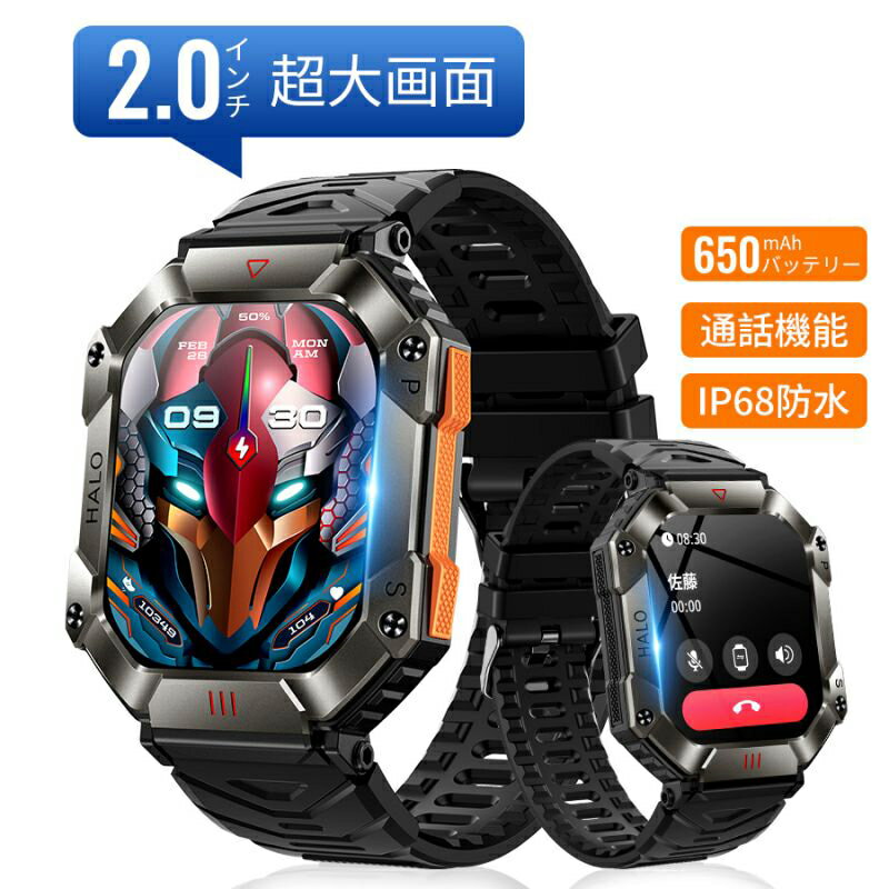 スマートウォッチ メンズ 2.0インチ大画面 650mAhバッテリー Bluetooth5.3 通話機能 着信通知 IP68防水 文字盤 運動モード 活動量計 歩数計 コンパス 高度計 気圧計 音楽制御 目覚まし時計 カメラ制御 水飲みリマインダー スマホ探す 24時間健康管理 腕時計
