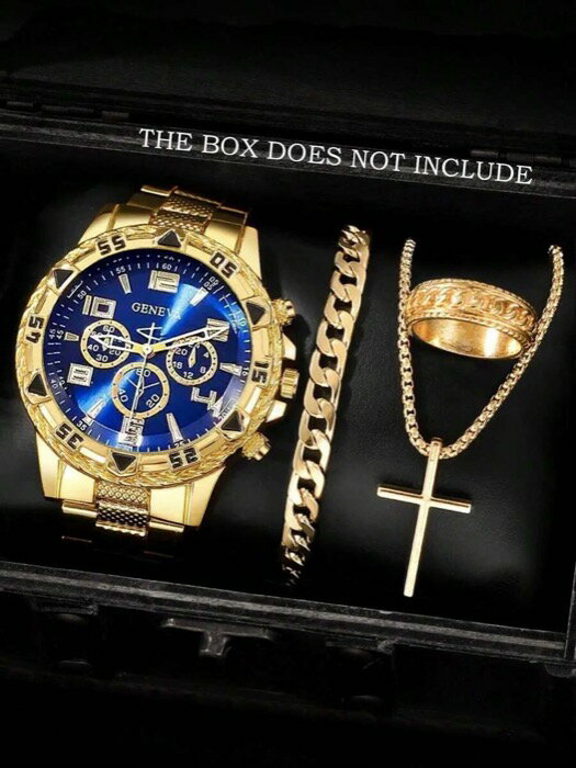 [ 8日から12日程度でお届け予定 ] 腕時計 メンズ セット ファッションビジネスレジャー メンズ腕時計 4点セット、大型ダイヤル ラウンド スチールバンド クォーツ腕時計、パーソナライズされたチェーンブレスレット、クロスペンダントネックレス、リングの