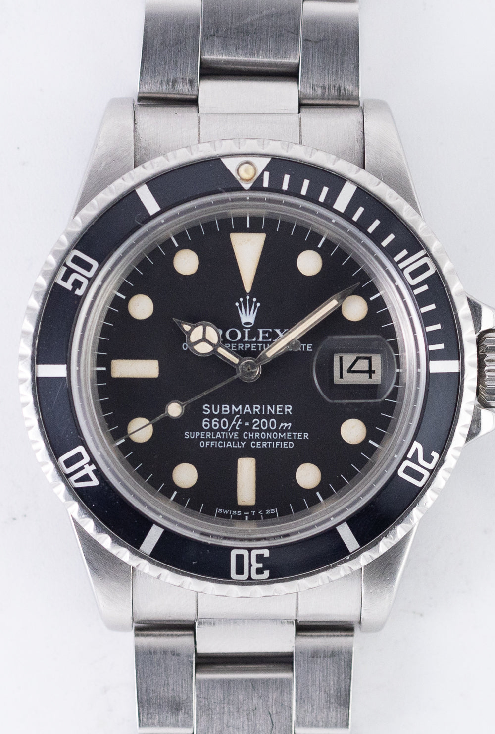 ? COMMENT Ref.1680は、1967年から1980年の間に生産された初のデイト付きサブマリーナーです。特に1975年までに生産された「SUBMARINER」の文字が赤い「赤サブ」に対し、本品は後期型の「白サブ」にあたります。この白サブのマーク3ダイヤルは、マーク1ダイヤルと同様にレムリッチ社製。マーク3ダイヤルは、Ref.1680の中でも製造割合が10%未満と言われており、希少性の高い仕様です。ベゼルは1969年から1979年までの間に製造されたマーク3ベゼルを備え、後期型のシャープ4からわずかにフラットな形状へと移行する過渡期の特徴が見られる個体です。クラスプコード「L2」のダブル無垢ブレスRef.93150にエンドリンク580番を装備し、オリジナル性の高いセットとなっています。 ケースは肉厚で力強い印象を保ち、大きな傷や打痕が見られません。使用感が表れやすいアウターパーツのベゼルは、大きな傷や剥げがなく、当時の状態をよく維持しています。ダイヤルはパーフェクトな状態、盤面やトリチウムの状態がしっかりしています。トリチウムは美しい淡いベージュに経年変化しています。針は最低限のエイジングが見られますが、肉眼ではほとんど気にならない理想的なものです。ブレスレットは伸びが少なく、しっかりとした装着感を維持しています。 デイト付きクロノメーター仕様のサブマリーナーは、実用性に優れながらも、コレクターの期待に応えるディテールが随所に見られます。本個体は、希少なマーク3ダイヤルや、特筆すべき良いコンディションを維持している点が魅力です。コレクション性と実用性を兼ね備えた、極めて完成度の高い個体といえるでしょう。 BRAND 世界初の本格的ダイバーズウォッチ<SUBMARINER(サブマリーナ)>の誕生は1953年。ファーストモデルの防水性は600ft=180m防水と言われ、当時としてはまさに驚異的な数字でした。ロレックスの成功はまさにサブマリーナであり、ブランドの基礎となった歴史的名機は今もなお多くのファンを虜にしています。 ? BRAND ROLEX MODEL SUBMARINER REFERENCE 1680 YEAR 1978 MATERIAL Stainless Steel WINDING Automatic CALIBER 1570 SERIAL 564++++ CASE DIAMETER 39.0mm CASE THICKNESS 14.7mm BETWEEN LUGS 20.0mm SERVICE Yes GUARANTEE 1 Year STRAP ROLEX Genuine Bracelet BOX and PAPERS No ? COMMENT The Ref. 1680 is the first Submariner equipped with a date function, produced from 1967 to 1980. While the early models produced until 1975 are known as the "Red Sub" due to the red "SUBMARINER" text, this piece belongs to the later "White Sub" generation. The Mark 3 dial of this White Sub was manufactured by Lemrich, just like the Mark 1 dial. Mark 3 dials account for less than 10% of all Ref. 1680 models, making this a particularly rare variant. The bezel is a Mark 3 type, produced between 1969 and 1979, showcasing transitional features as the sharp "4" evolved into a slightly flatter shape in later models. This piece retains an original and well-matched set, featuring a Ref. 93150 double solid-link bracelet with clasp code "L2" and 580 end links. The case remains thick and robust, with no major scratches or dents. The bezel, an area prone to wear, is free from significant damage or fading, maintaining its original integrity. Functionality is smooth, and all features operate as expected. The dial is in perfect condition, with no signs of damage or aging. The edges of the dial show no flaking, and the tritium lume has aged into a beautiful patina. The hands exhibit minimal aging, barely noticeable to the naked eye. The bracelet has little stretch, ensuring a firm and comfortable fit, making this an ideal vintage piece in excellent condition. The Submariner with a date function offers both practicality and collector appeal, featuring historically significant details that enthusiasts seek. This example stands out with its rare Mark 3 dial and remarkable overall condition. It is a highly refined piece that seamlessly balances collectability and functionality. BRAND The world’s first professional dive watch, the Submariner, debuted in 1953. Its initial waterproof rating of 600ft (180m) was astonishing at the time. The Submariner is undeniably one of Rolex’s most successful creations, forming the foundation of the brand’s legacy. This historic model continues to captivate collectors and enthusiasts worldwide.