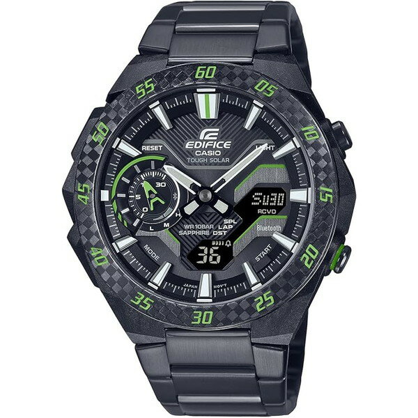 高機能モータースポーツウオッチEDIFICEから、フォーミュラカーが走る時の空気の流れに着想を得てデザインされたECB-2200YRC CARBON WINDFLOWです。カーボンファイバー強化樹脂ケースにカーボンファイバーベゼルとブラックIPを施したステンレススチールバンドを組み合わせ、アクセントカラーでレーシーに仕上げました。Bluetooth及びタフソーラーを搭載。スマートフォンアプリと接続し、正確な時刻表示のための自動時刻修正、ワールドタイム、ストップウオッチ計測データのスマートフォン転送、携帯電話探索などを可能にしています。タフソーラーは蛍光灯などのわずかな光でも発電します。 ●10気圧防水 ●タフソーラー(ソーラー充電システム) ●モバイルリンク機能(対応携帯電話とのBluetoothR通信による機能連動) ●針退避機能(針が液晶表示と重なって見づらいときは、針を液晶表示の上から一時的に退避させることができます) ●ワールドタイム:世界38都市(38タイムゾーン、サマータイム自動設定機能付き)+UTC(協定世界時)の時刻表示、ホームタイムの都市入替機能 ●ストップウオッチ(1/100秒(1時間未満)/1秒(1時間以上)、24時間計、ラップ/スプリット付き) ●タイマー(セット単位:1秒、最大セット:60分、1秒単位で計測、予告音付き) ●時刻アラーム5本(予告音付き)・時報 ●バッテリーインジケーター表示 ●パワーセービング機能(暗所では一定時間が経過すると表示を消し運針を停止して節電します) ●フルオートカレンダー ●12/24時間制表示切替 ●操作音ON/OFF切替機能 ●カウントダウンタイマー予告音ON/OFF切替機能 ●曜日表示(英・西・仏・独・伊・露の6ヶ国語切替) ●ダブルLEDライト: 文字板用LEDライト(スーパーイルミネーター、残照機能、残照時間切替(1.5秒/3秒)付き) LCD部用LEDバックライト(スーパーイルミネーター、残照機能、残照時間切替(1.5秒/3秒)付き) ●フル充電時からソーラー発電無しの状態での駆動時間 機能使用の場合:約7ヵ月 パワーセービング状態の場合:約18ヵ月 ※ スマートフォンと連携しない場合は、通常のクオーツ精度(平均月差±15秒)で動作します。 ●ネオブライト ●ケース・ベゼル材質:樹脂/ステンレス ●内面反射防止コーティングサファイアガラス ●ステンレスムクバンド(対応する腕回り):150~205mm ●サイズ(H×W×D)/質量:47.6×48.2×11.9mm/129g