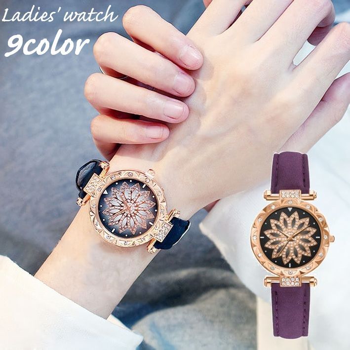 送料無料 腕時計 リストウォッチ レディース 女性用 アナログ ラウンド 丸型 ラインストーン フラワー レザー調 キラキラ 上品 おしゃれ きれいめ エレガント 可愛い 通勤 おでかけ レディースウォッチ ファッション小物 プレゼント ギフト 贈り物 婦人用