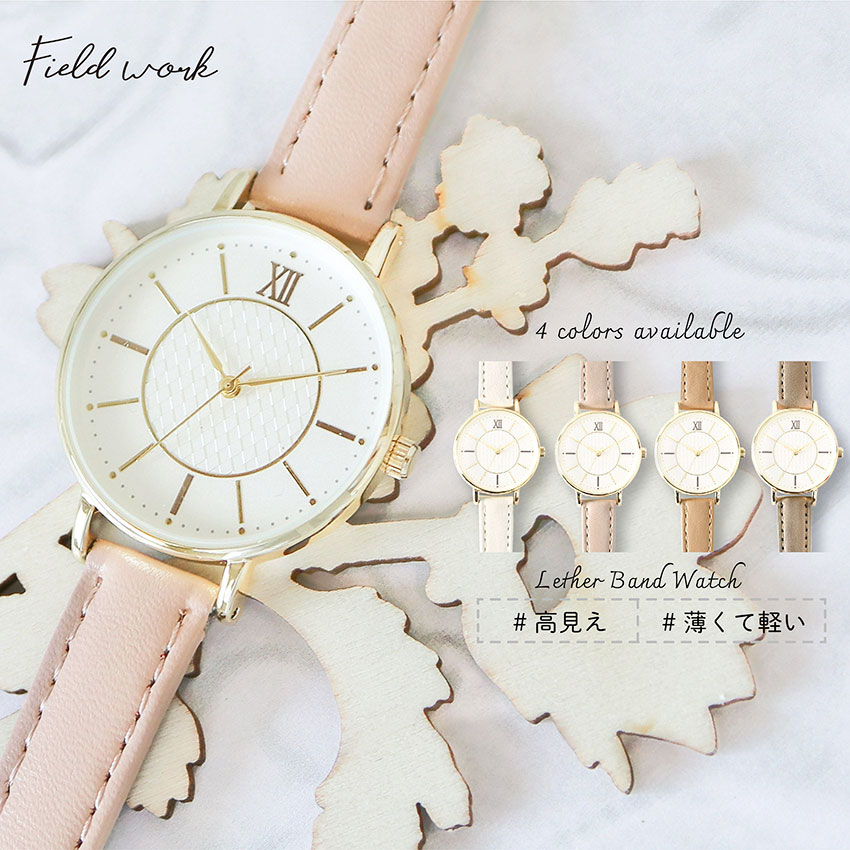 おすすめ防水ウォッチ 商品情報 ケースサイズ 28mm ケース厚 約8mm ベルト全長 約212mm 着用目安(手首サイズ) 約13cm〜17cm 重さ 約20.4g ケース素材 合金 ベルト素材 合成皮革(防水レザー) ムーブメント 日本製:ステップムーブ 生産国 PRC 防水機能 10気圧防水 使用推奨気温 5度~35度 色展開(ケース全てピンクゴールド) 1 グレー 2 ベージュ 3 ピンク 4 ブラウン 5 ブラック 6 ピンクグレー 7 グレージュ 8 ホワイト 9 ニューピンク 10 ブルー 11 ダスティブルー(当店限定色) 12 ダスティパープル(当店限定色) 注意事項 時計使用時の注意点 ・装着時に折り曲げない ・過度に引っ張らない ・きつく締めない ・毎日同じ物を使用しない(休ませる) ・使用後はクロスで拭く ・夏場は汗を拭き取り、陰干しする 本商品はソーラー、スマートウォッチではございません。 お使いのスマートフォンの発色具合により、実際の物と写真の色味が違う(見え方が違う)場合がございます。 初期に入っている電池は、店舗が時計の動作確認をするためのモニター用電池です。 工場での生産時に満タンの電池を入れておりますが、製造時期によって電池残量に差が生じますので、予めご了承くださいませ。 ※モニター電池は使用中の電池になりますので、無料サービスで時計代金には含まれておりません。 ムーブメントへの湿気、ゴミの侵入防止のためにリューズの開放はせず、動いた状態でのお届けとなります。 ベルトやケースに塗装のされているものは、ぶつけたり、経年劣化で剥がれることがございます。 使用による経年劣化やベルトのヘタリなどお困りのことがございましたら、お修理にて対応できることもございますので時計サービスセンターまでご連絡くださいませ。 フィールドワーク時計サービスセンター:03-5956-5032おすすめ商品 → 全ての商品を見る ← お勧めのイベント、利用シーン:バレンタイン、ホワイトデー、母の日、父の日、こどもの日、クリスマス、誕生日、記念日、ビジネス、仕事、入社、入学式、卒業式、卒園式、入園式、内祝いお返し、結婚記念日、新生活、就職、デート、同窓会、パーティー、コンサート、ミュージカル、ランチ、ディナー、女子会、保護者会、オフィス、オフィスカジュアル、お出かけお勧めの相手:娘、息子、妻、夫、姉、妹、彼氏、彼女、パートナー、お母さん、お父さん、小学生、中学生、高校生、大学生、社会人、友達、看護師、保育士 有料オプションはご注文確定時に金額へ反映されておりません。 注文後、店舗にてご注文データの修正を行い、+1200円分追加させていただきます。 オプションは、クーポン適用外となりますので、あらかじめご了承ください。