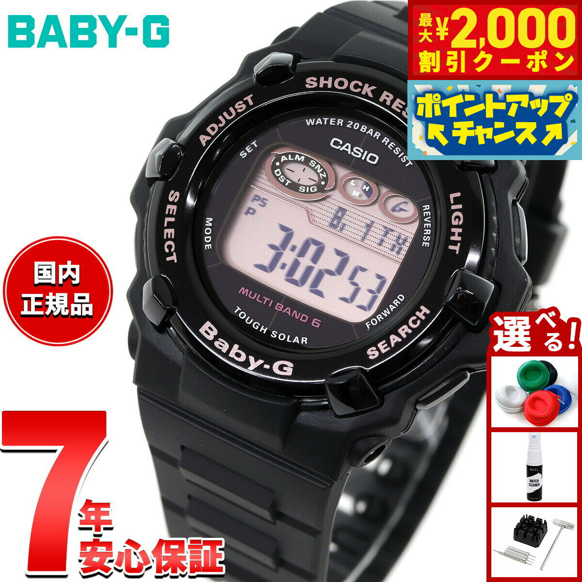 「入荷次第出荷」表記の商品のうち、仕入先にて在庫切れとなっていた場合、 一部商品を除き約1ヶ月以上お時間を頂く場合がございます。予めご了承ください。 お急ぎのお客様は、在庫状況を確認させて頂きますので、ご購入前にお問い合わせ下さいます様お願い申しあげます。BABY-G■アクティブな女性のためのカジュアルウオッチBABY-G。薄型ラウンドフェイスのデジタルモデルです。■カラーはブラック×ピンクをラインナップ。■バリエーション豊かでコーディネートを華やかに仕上げます。ホーム都市設定を変えるだけで日本国内はもとより、海外でも時刻を自動修正します。■機能面では、世界6局の標準電波に対応しタフソーラーも搭載。更に20気圧防水機能にも対応し実用性も兼ね備えました。ワールドタイムやストップウオッチなどの機能も充実。アクティブな女性をサポートするモデルです。 ※本商品が対象となるクーポンは、その期間終了後、同一内容でのクーポンが継続発行される場合がございます。