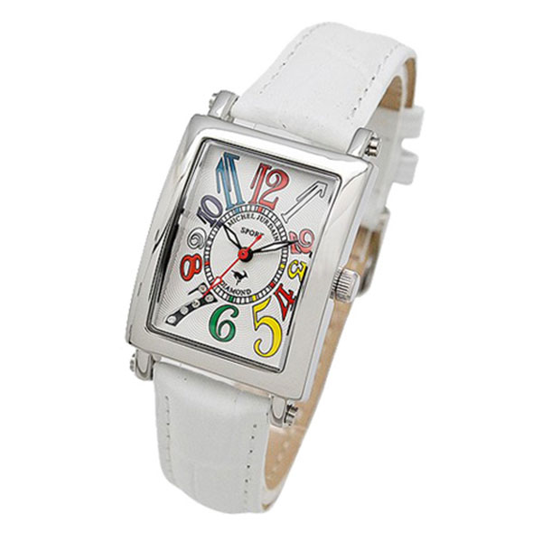 【無料特典付き!】ミッシェルジョルダン スポーツ 時計 レディース 腕時計 手表 シルバーケース 白 ホワイト レザー ダイヤモンド カラフル 長方形型 革 SL-3000-6 時計 誕生日 ギフト クリスマスプレゼント ランキング お祝い