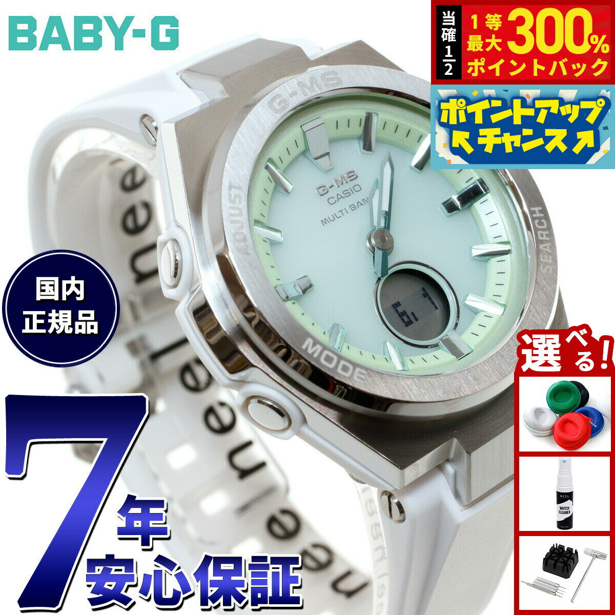 アクティブで洗練された女性に向けたBABY-G G-MS(ジーミズ)。今回のモデルは春らしい草木や花をイメージしたカラーリングのウオッチです。爽やかながら落ち着きのある色調が、カジュアルファッションにほどよくマッチします。ベースモデルには電波ソーラーモデルのMSG-W200をセレクト。時分針とデジタル窓を組み合わせたデジタル・アナログコンビネーションモデルで、機能面では、世界6局の標準電波に対応し時刻を自動修正するマルチバンド6、ワールドタイム、タフソーラー等、頼れる機能を備えています。アクティブシーンで役立つ機能はそのままに、オンタイムからオフタイムまで活躍するG-MSです。商品名BABY-G カシオ ベビーG レディース G-MS 電波 ソーラー 腕時計 タフソーラー MSG-W200FE-7AJF商品番号MSG-W200FE-7AJFブランドカシオ ベビーG CASIO BABY-Gムーブメントアナデジ ソーラー電波時計 モジュールNo:5575■耐衝撃構造■タフソーラー(ソーラー充電システム)■10気圧防水機能■電波受信機能:自動受信(最大6回/日)(中国電波は最大5回/日)/手動受信、<日本>受信電波:JJY、周波数:40kHz/60kHz(福島/九州両局対応モデル)<北米地域>受信電波:WWVB、周波数:60kHz<ヨーロッパ地域>受信電波:MSF/DCF77、周波数:60kHz/77.5kHz<中国>受信電波:BPC、周波数:68.5kHz*ホームタイム設定を受信可能な都市に設定すると、都市に合わせた局を受信します。尚、時差は選択した都市によって設定されます。■ワールドタイム:世界48都市(31タイムゾーン、サマータイム設定機能付き)+UTC(協定世界時)の時刻表示、ホームタイムの都市入替機能■ストップウオッチ(1/100秒、60分計、スプリット付き)■タイマー(セット単位:1分、最大セット:60分、1秒単位で計測)■時刻アラーム・時報■バッテリーインジケーター表示■パワーセービング機能(暗所では一定時間が経過すると表示を消して節電します)■フルオートカレンダー■12/24時間制表示切替■操作音ON/OFF切替機能■LEDライト(スーパーイルミネーター、残照機能付き)■フル充電時からソーラー発電無しの状態での駆動時間機能使用の場合:約8ヵ月パワーセービング状態の場合:約20ヵ月※電波受信が行われない場合は、通常のクオーツ精度(平均月差±30秒)で動作します。ショックレジストネオブライトLED:ホワイトバンド装着可能サイズ:125〜180mm第一駒幅:19.9mm風防素材無機ガラスケース素材樹脂/ステンレススチールケースサイズ47.5×38.4mmケース厚12.3mmバンド素材樹脂バンドバンド留金タイプ美錠腕周り(最大)18cm文字盤カラーグリーン本体重量42g保証期間メーカー正規保証1年間付属取扱説明書 / 保証書 / 専用BOXその他のサービスメーカー希望小売価格はメーカーサイトに基づいて掲載していますBABY-G カシオ ベビーG レディース G-MS 電波 ソーラー 腕時計 タフソーラー MSG-W200FE-7AJF【2024 新作】アクティブで洗練された女性に向けたBABY-G G-MS(ジーミズ)。今回のモデルは春らしい草木や花をイメージしたカラーリングのウオッチです。爽やかながら落ち着きのある色調が、カジュアルファッションにほどよくマッチします。ベースモデルには電波ソーラーモデルのMSG-W200をセレクト。時分針とデジタル窓を組み合わせたデジタル・アナログコンビネーションモデルで、機能面では、世界6局の標準電波に対応し時刻を自動修正するマルチバンド6、ワールドタイム、タフソーラー等、頼れる機能を備えています。アクティブシーンで役立つ機能はそのままに、オンタイムからオフタイムまで活躍するG-MSです。