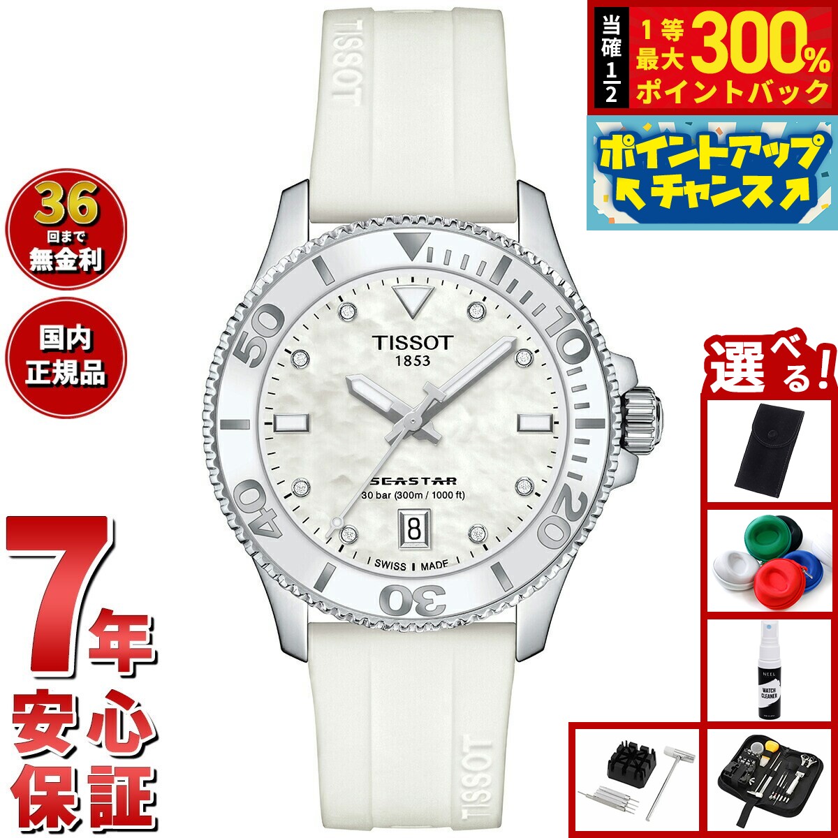 高い防水性を実現し、シティスタイルに溶け込むエレガントなデザインを融合したトータルバランスに優れたダイバーズウォッチ。そしてダイバーズウォッチのジェンダーの壁を打ち破る、36mmサイズのシースターが登場しました。30気圧防水を実装、逆回転防止ベゼルにアルミニウムを採用することで対傷性能の強化と軽量化を実現しています。商品名ティソ TISSOT シースター SEASTAR 1000 36MM クオーツ T120.210.17.116.00 ダイバーウォッチ 腕時計 メンズ レディース商品番号T1202101711600ブランドティソ TISSOTムーブメントクォーツ 30気圧防水(300m/1000ft)時、分、秒、日付ねじ込み式リューズとケースバック逆回転防止ベゼルダイヤモンド、マザー・オブ・パールスイス製風防素材傷防止加工両面無反射コーティングサファイアクリスタルケース素材316L ステンレススチールケースサイズ36×36mmケース厚9.7mmバンド素材ラバーバンド留金タイプ尾錠バンド幅18mm文字盤カラーホワイト マザー・オブ・パール保証期間メーカー2年間保証付属取扱説明書 / 保証書 / 専用BOXその他のサービスティソ TISSOT シースター SEASTAR 1000 36MM クオーツT120.210.17.116.00 ダイバーズウォッチ 腕時計 メンズ レディース高い防水性を実現し、シティスタイルに溶け込むエレガントなデザインを融合したトータルバランスに優れたダイバーズウォッチ。そしてダイバーズウォッチのジェンダーの壁を打ち破る、36mmサイズのシースターが登場しました。30気圧防水を実装、逆回転防止ベゼルにアルミニウムを採用することで対傷性能の強化と軽量化を実現しています。