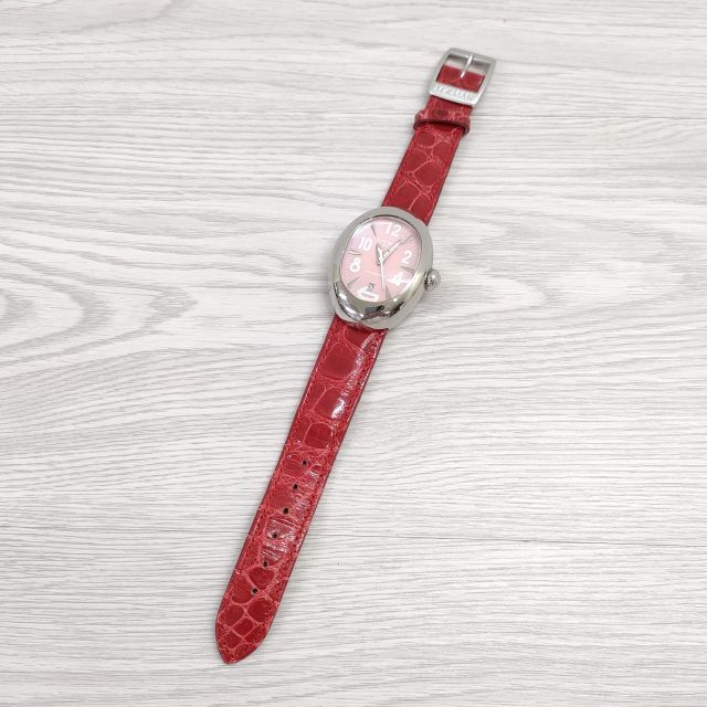 ●型番 :028●素材 :ステンレス●ベルト :純正ピンク革ベルト・尾錠●機械タイプ :クォーツ(作動中)●防水性 :日常生活防水●機能 :カレンダー●仕様 :ダイヤベゼル●文字盤 :ピンクシェル●ケースサイズ :W32×H36mm(リューズ除く)●ベルトサイズ :腕回り(内径) 最長17.5cm / ラグ幅:16mm付属品:なしUSED品ガラス傷はありません。時計本体には小傷や薄い線傷が見られます。ベルトにもスレや汚れや角はがれなどがあり、固定ループも切れて無くなっております。管理No:37F1022★掲載の商品は全て一点物となっております。インターネット販売と店頭販売を並行しておりますので売り切れている場合がございます。予めご了承下さい。 *万が一売り切れの場合は当店より直接メールにてお知らせいたします。