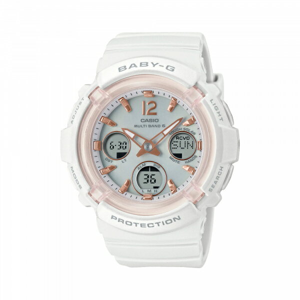 夏のビーチをテーマに、ビーチ周辺で見られる美しいものをカラーリングした「ビーチ・トラベラー・シリーズ」です。文字板の見切り部分にはスケルトン素材を採用し、海の水面を表現。時分針や見切りインデックスには舵と錨のモチーフをデザインし、ビーチアクティビティにぴったりのモチーフを散りばめました。バーインデックスを採用しシンプルに仕上げています。また、ライトを点灯すると、時分針がピンクや緑に光り幻想的な夜の海を連想させます。マルチバンド6、ワールドタイム、タフソーラー等、頼れる機能も備えたBABY-Gです。【デザイン・カラー】■BGA-2500-1AJF○ビーチ沿いに広がる街の夜景を連想させるブラック■BGA-2500-4AJF○太陽の光を反射し輝く貝殻のピンク■BGA-2500-7AJF○真っ白な砂浜のホワイト【主な特徴】10気圧防水/衝撃に強い/暗所で見やすい/カジュアルデザイン/海のレジャーに最適【ケースサイズ(縦×横×厚さ)】■45.2 × 41 × 13.3 mm【質量】■39g【ケース・ベゼル材質】■樹脂【バンド材質】■樹脂バンド【構造】■耐衝撃構造(ショックレジスト)【防水性】■10気圧防水【使用電源・電池寿命】■タフソーラー(ソーラー充電システム)【時刻修正】■電波時計 日本・北米・ヨーロッパ・中国地域対応 MULTIBAND6【外装】■ガラス:無機ガラス■その他:ネオブライト【ワールドタイム】■ワールドタイム:世界48都市(31タイムゾーン、サマータイム設定機能付き)+UTC(協定世界時)の時刻表示、ホームタイムの都市入替機能【ストップウオッチ】■ストップウオッチ(1/100秒、60分計、スプリット付き)【タイマー】■タイマー(セット単位:1秒、最大セット:100分、1秒単位で計測)【アラーム/時報】■時刻アラーム5本(カウントダウン機能付き)・時報【ライト】■ダブルLEDライト:文字板用LEDライト(フルオートライト、ネオンイルミネーター、残照機能、残照時間切替(1.5秒/3秒)付き)、LCD部用LEDバックライト(フルオートライト、スーパーイルミネーター、残照機能、残照時間切替(1.5秒/3秒)付き)【ライトカラー】■LED:ホワイト■ネオンイルミネーター【カレンダー】■フルオートカレンダー【操作音ON/OFF切替機能】■操作音ON/OFF切替機能【パワーセービング機能】■パワーセービング機能(暗所では一定時間が経過すると表示を消して節電します)【バッテリー表示/警告】■バッテリーインジケーター表示【駆動時間】■フル充電時からソーラー発電無しの状態での駆動時間○機能使用の場合:約7ヵ月○パワーセービング状態の場合:約18ヵ月【精度】※電波受信が行われない場合は、通常のクオーツ精度(平均月差±30秒)で動作します。【その他機能】■12/24時間制表示切替■針退避機能(針が液晶表示と重なって見づらいときは、針を液晶表示の上から一時的に退避させることができます)【時刻修正詳細】■ホームタイム都市(受信機能対応都市)/受信電波○東京、ソウル、台北/日本の標準電波JJY40・JJY60○(ホノルル)、(アンカレジ)、バンクーバー、ロサンゼルス、エドモントン、デンバー、メキシコシティ、シカゴ、ニューヨーク、ハリファックス、セントジョンズ/アメリカの標準電波WWVB○リスボン、ロンドン、マドリード、パリ、ローマ、ベルリン、ストックホルム、アテネ、(モスクワ)/イギリスの標準電波MSF・ドイツの標準電波DCF77○香港、北京/中国の標準電波BPC※( )内の各都市は条件が良ければ受信する場合もあります。電波受信機能:自動受信(最大6回/日)(中国電波は最大5回/日)/手動受信<日本>受信電波:JJY、周波数:40kHz /60kHz(福島/九州両局対応モデル)<北米地域>受信電波:WWVB、周波数:60kHz<ヨーロッパ地域>受信電波:MSF/DCF77、周波数:60kHz /77.5kHz<中国>受信電波:BPC、周波数:68.5kHz*ホームタイム設定を受信可能な都市に設定すると、都市に合わせた局を受信します。尚、時差は選択した都市によって設定されます。【注意事項】※ご使用前に、付属の取り扱い説明書をよく読んでください。■BABY-Gは、 G-SHOCKから生まれた、 タフでカラフルな腕時計。ファッション、 カルチャー、 スポーツまで さまざまなシーンに 寄り添う、毎日を自分らしく 楽しむ女の子から 愛されるウオッチです。 【ギフト/プレゼント/腕時計/防水/水に強い/衝撃に強い/壊れない/壊れにくい/CASIO/BABY-G/ベイビーG/ベビーG/ベビージー/ギフト/プレゼント/贈り物/普段使い/国内正規品】