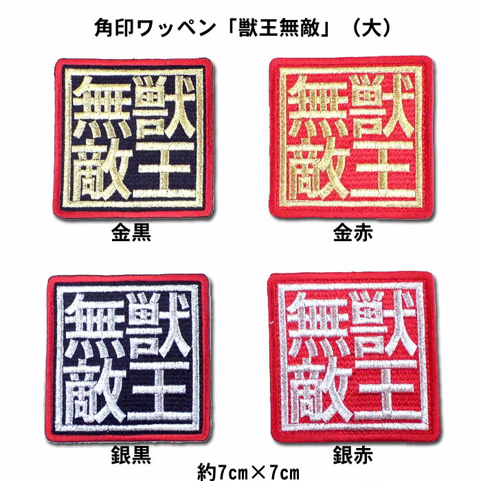 商品説明 角印ワッペン「獣王無敵」(大) 応援歌ワッペンなどと共にワンポイントアクセントにいかがですか? アイロン圧着式です カラー 金黒、金赤、銀黒、銀赤 サイズ 約横7cm×約縦7cm ご注意 ●刺繍ユニホームは別売りです。 ●商品の色・形状等予告無く変更する場合があります。予めご了承下さい。 ●当店にて他の商品と同時購入の場合、最長納期に合わせての発送となります。