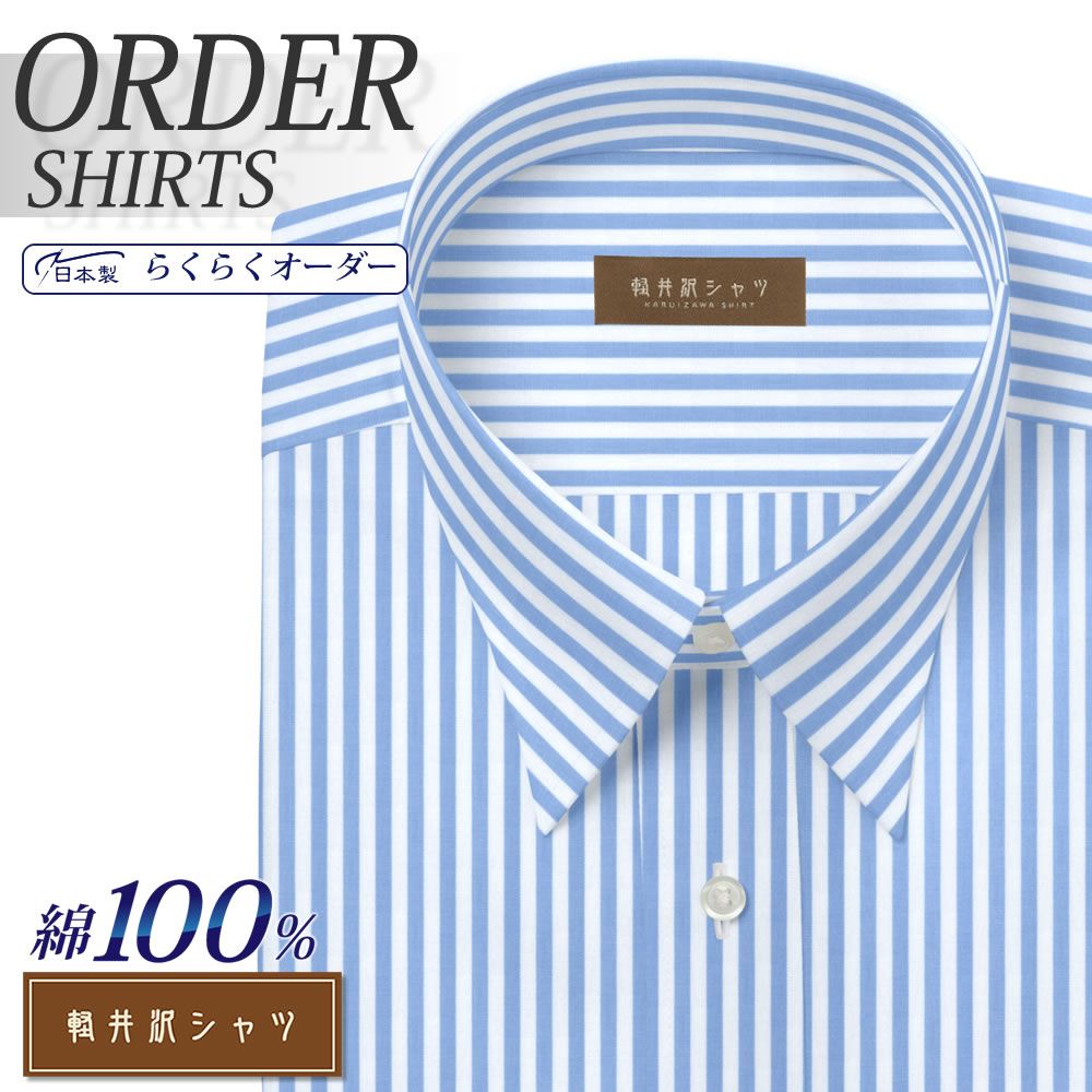 オーダーシャツ デザイン変更可能 ワイシャツ Yシャツ オーダーワイシャツ メンズ 長袖 半袖 七分 大きいサイズ スリム らくらく オーダー 日本製 形態安定 綿100% 軽井沢シャツ レギュラーカラー ライトブルー太ロンドンストライプ [R10KZR548] 送料無料