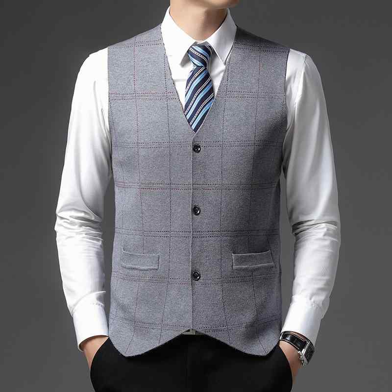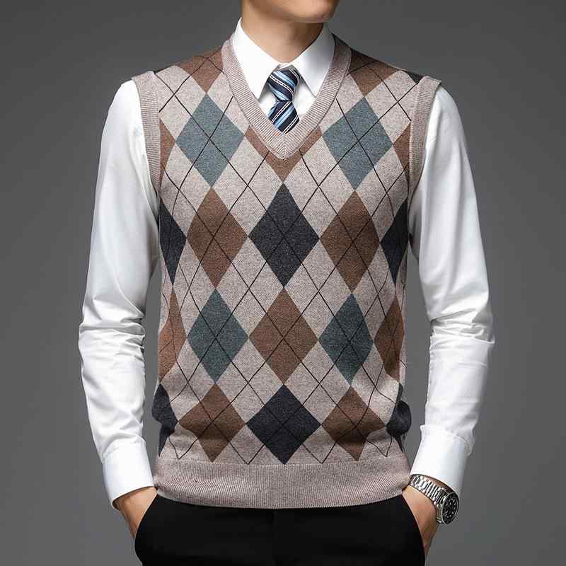 ベスト ジレ メンズ 男性 ウール ウール ノースリーブ ニット セーター シングルボタン カーディガン Vネック 厚手 チェック柄 ベルベット ベロア アクリル混 ビジネス カジュアル インナー 重ね着 冬物 ミドルエイジ 中高年