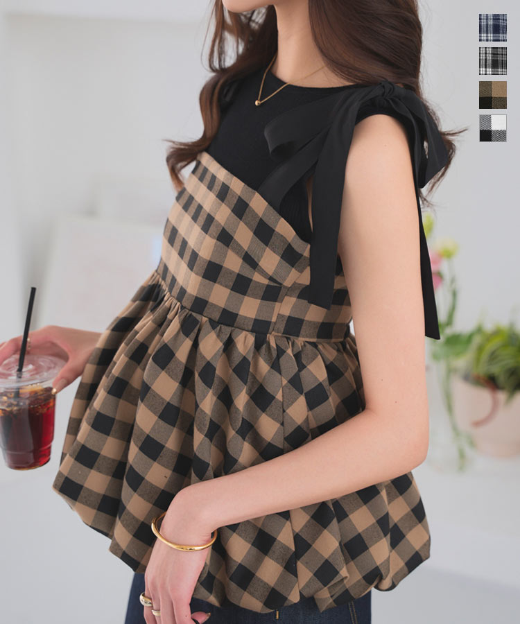ビスチェ トップス キャミソール レディース チェック柄 バルーン リボン [C7550] バブルヘム 20代 30代 40代 ベスト リボン チェック ギンガム ギンガムチェック バルーントップス 体型カバー レイヤード 重ね着 夏 春夏 春 かわいい 大人可愛い ネイビー ブラウン