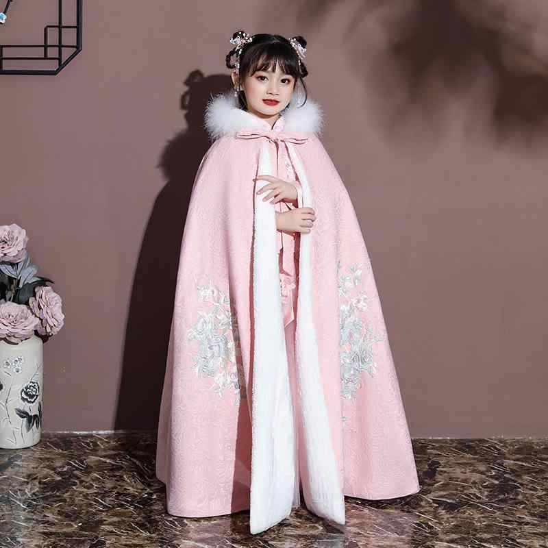 中華風ケープ 女の子 キッズ ファー襟 裏起毛 厚手 冬 防寒 あったか やわらか プリンセス 花柄 お出かけ マント ポンチョ 漢服スタイル 唐装風