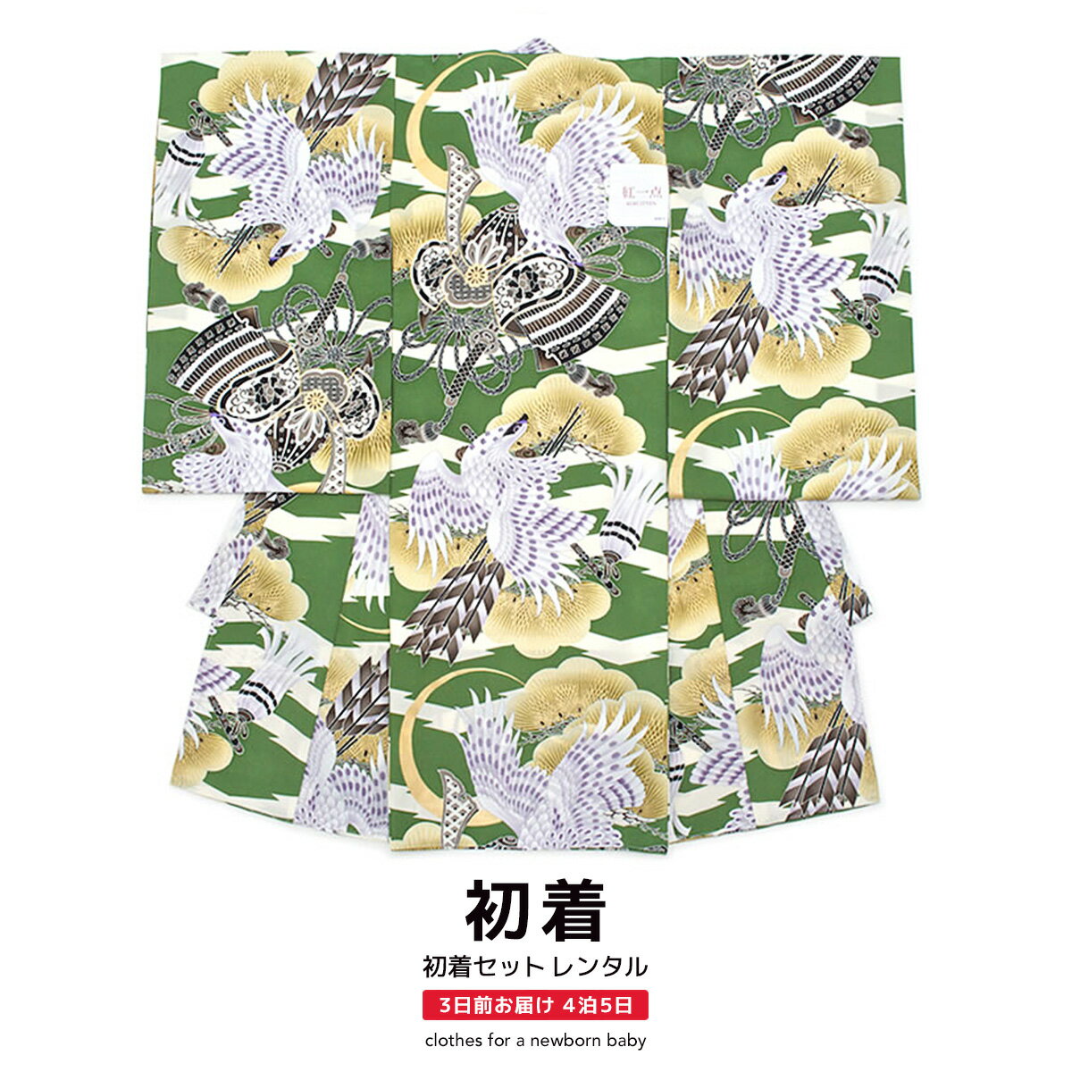 【スーパーSALE限定☆最大3000円クーポン配布中☆】【レンタル】 お宮参り 男の子 レンタル 産着 フルセット 緑 グリーン 茶 鷹 松 通年 掛け着 うぶぎ 祝着 子供着物 産着セット 祝着セット 赤ちゃん 祝い着 帽子 よだれかけ 創美苑 往復送料無料