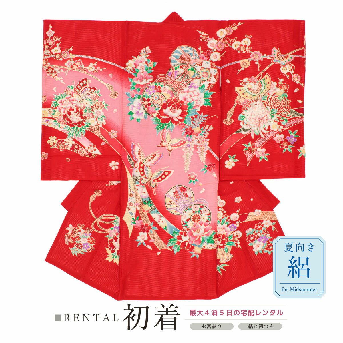 【スーパーSALE限定☆最大3000円クーポン配布中☆】【レンタル】 お宮参り 女の子 レンタル 産着 フルセット 赤 鼓 蝶 熨斗 牡丹 菊 梅 絽 夏向け 掛け着 うぶぎ 祝着 子供着物 産着セット 祝着セット 赤ちゃん 祝い着 帽子 よだれかけ 創美苑 往復送料無料