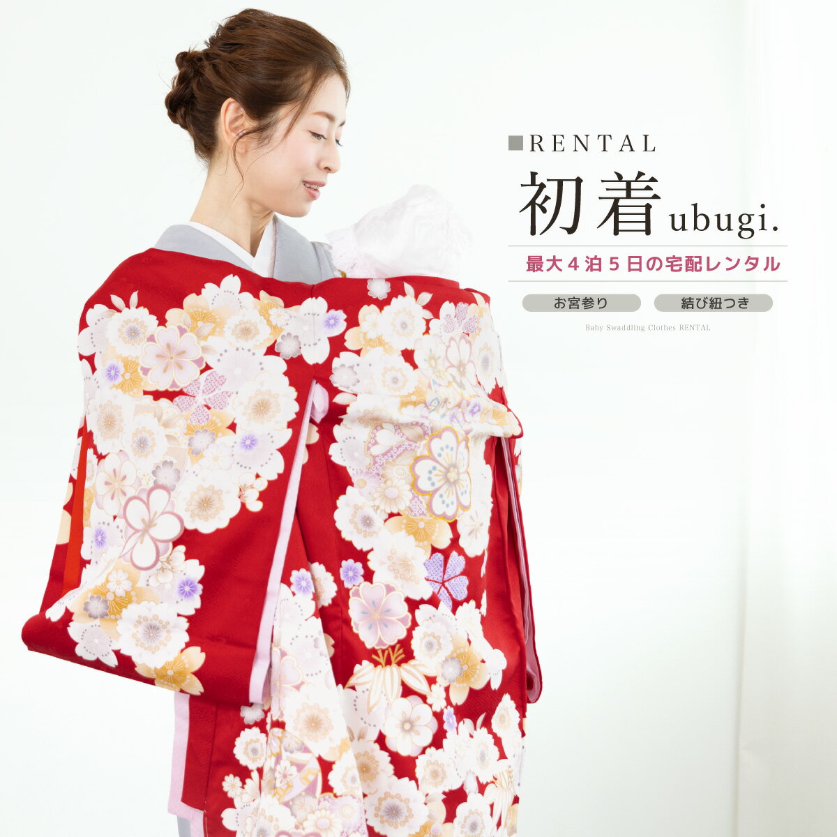 【スーパーSALE限定☆最大3000円クーポン配布中☆】【レンタル】 お宮参り 女の子 レンタル 産着 フルセット 赤 レッド 桜 花 ポリエステル 掛け着 うぶぎ 祝着 記念撮影 赤ちゃん 祝い着 帽子 よだれかけ 創美苑 往復送料無料