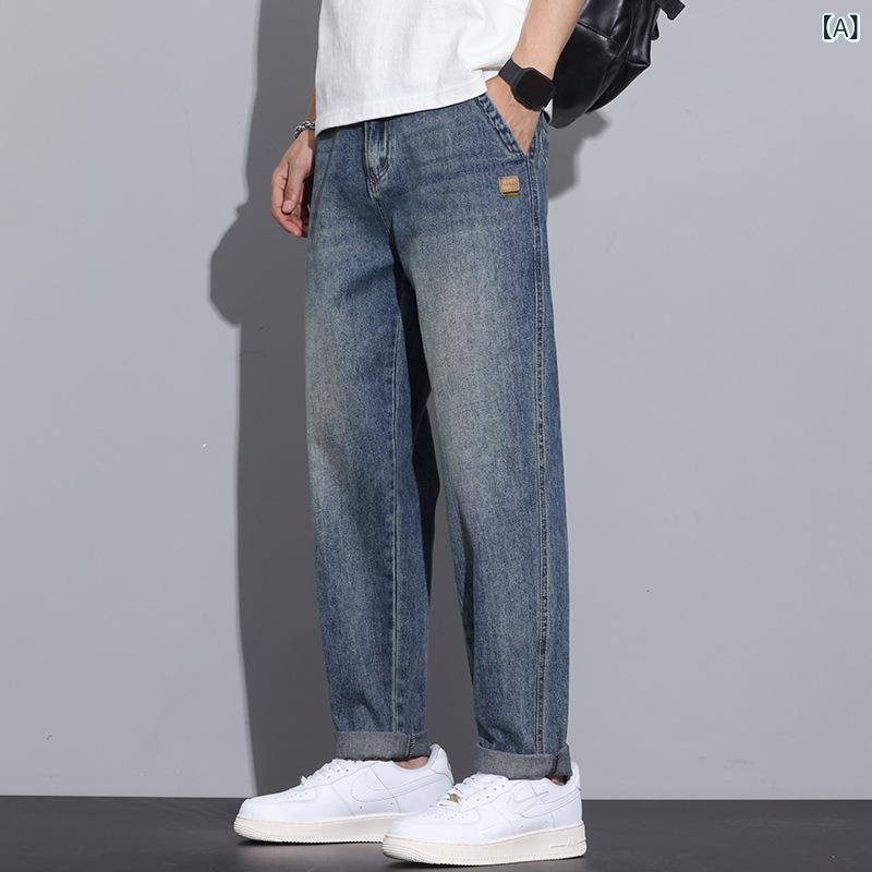 ジーンズ メンズ 男性用 春夏 ウォッシュ加工 ブルー トレンド ルーズ ストレート ミドルウエスト ベーシック スタイルアップ コットン デニム デイリー カジュアル ノンストレッチ ヴィンテージブルー