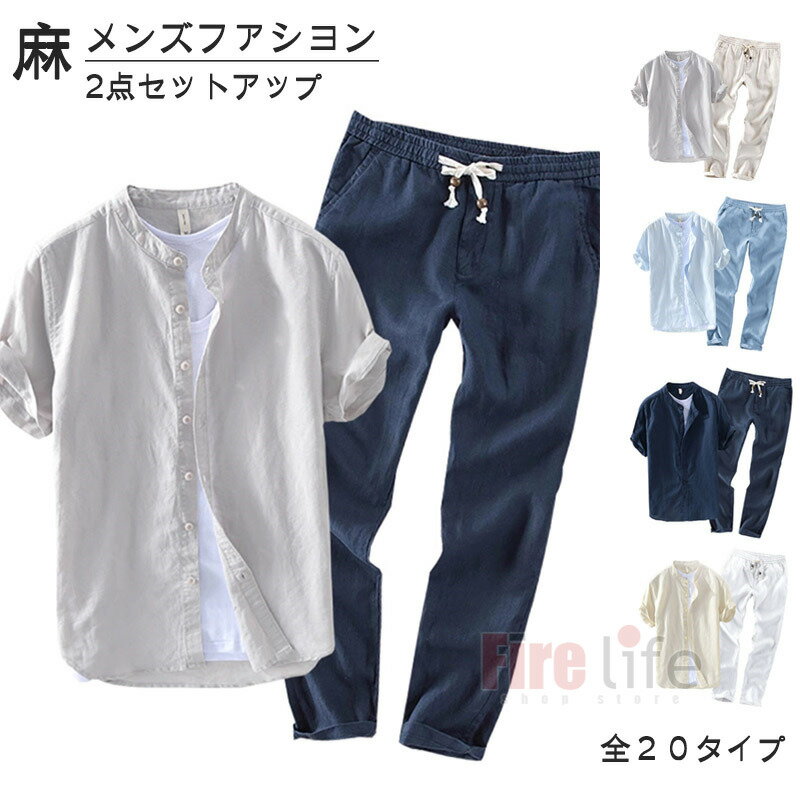 リネンシャツ メンズ 2点セットアップ スタンドカラー 半袖シャツ ロングパンツ 麻混トレーニング 全20タイプ カジュアル ランニングウェア スポーツウェア トレーナー 部屋着 軽量 無地 薄手 夏物 通気性よい 父の日 ホワイト 亜麻色 ブルー オシャレ M~3XL 送料無料