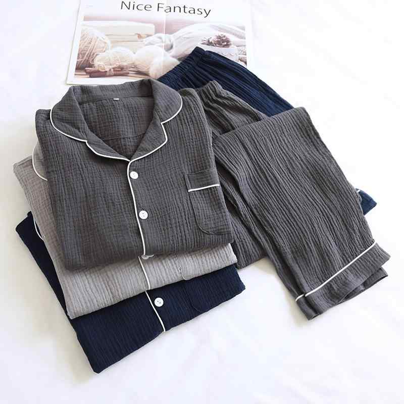 ・カテゴリ: セットアップ・スタイル: シンプルカジュアル・主な素材: ダブルガーゼ・厚さ: 薄手・ネックライン: 襟付き・袖丈: 長袖・パンツ丈: ロング・目的: 部屋着・カラー展開: ライトグレー、ダークグレー、ネイビー・サイズ展開: M、L、XL、XXL