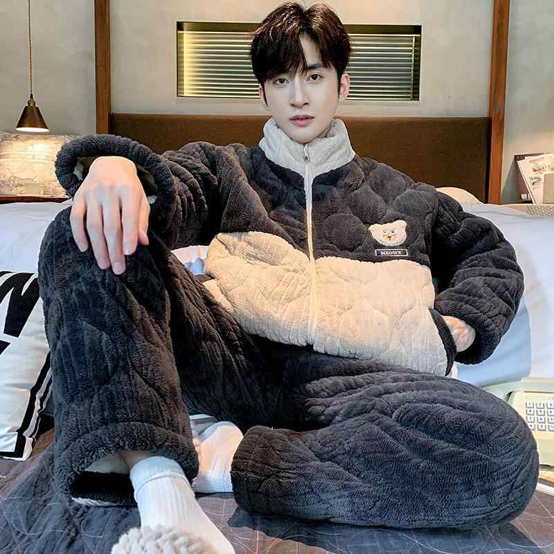 パジャマ メンズ 冬 三層中綿入り サンゴフリース 極厚 裏起毛 保温 快適 ジップアップ ハイネック 長袖 長パンツ ルームウェア 部屋着 上下セット