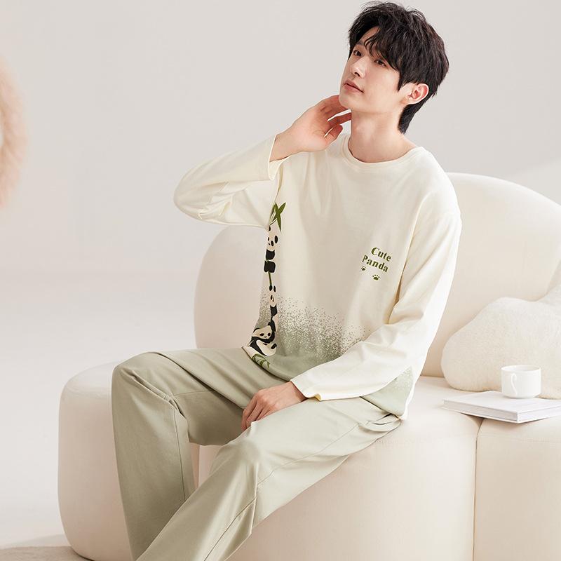 ルームウェア メンズ パジャマ 男性用 上下セット 綿ライク 長袖 長ズボン ラウンドネック カジュアル シンプル 部屋着 快適 ホームウェア お出かけ対応 若者 秋冬