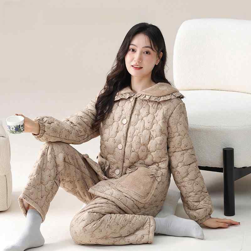 パジャマ レディース 女性用 コーラルフリース 三層構造 極厚 裏起毛 中綿入り 保温 あったか 長袖 長ズボン 上下セット 襟付き 秋冬 部屋着 ルームウェア