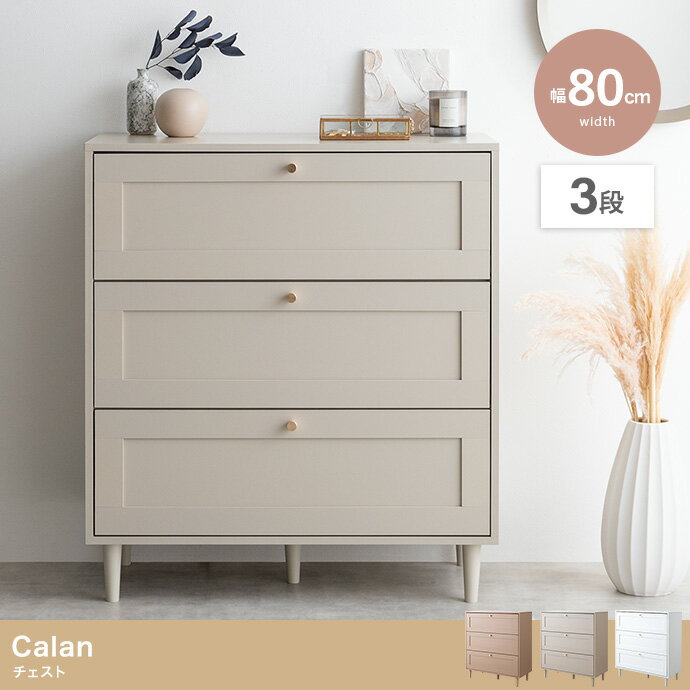 商品のご紹介 チェスト Calan シャンパンゴールドの取っ手と引き出しの框デザインがアクセントになったチェスト。たっぷり収納できるので、物が多くて隠したいご家庭にもオススメです。 ■海外インテリアのような、クラシカル扉 引き出しにあしらった框デザイン。シックで上品な雰囲気を醸し出します。モダンテイストにもマッチします。 ■シャンパンゴールドの取ってがアクセント 引き出しには、ディテールにこだわったシャンパンゴールドの取っ手を採用。上品に輝きつつもスッキリとした印象を醸し出します。 ■スリムなのに大容量収納できる3段チェスト 3段に分かれており、段毎に分けて収納できるので、整理しながら1台にたっぷり収納することができます。 ■厚めの物も収納できる深さ13.2cmの引き出し 厚めの物や少し高さのある物も収納可能なので、冬物やBOXなど幅広いサイズの物の収納ができます。 ■物が取り出しやすいスライドレール引き出し スムーズに開閉できるので、重みの増した引き出しも軽い力で開閉できます。中身はそのままで引き出しの入れ替えもカンタンです。 ※この商品はお客様組立となります。 ※組み立て方や若干の個体差によって、表記サイズと完成形のサイズに多少の誤差が生じる場合がございます。 サイズ 約 W80 x D38 x H90.2cm 材質 パーティクルボード(メラミンシート貼り) カラー ピンクベージュ・グレージュ・ホワイト 生産国 中国 類似商品はこちらサイドボード キャビネット 幅90cm 木製 23,640円サイドキャビネット 幅60cm 2色対応 サイ41,140円完成品 5杯引出しチェスト 幅80cm キャビ37,340円チェスト 3段 キャビネット タンス 幅39.12,340円サイドボード 幅120cm 2色対応 完成品 55,160円チェスト 2段 キャビネット タンス 幅39.9,780円チェスト 収納 幅80cm 引き出し 3段 キ11,500円チェスト 5段 キャビネット タンス 幅39.18,080円チェスト 収納 幅40cm 引き出し 3段 キ8,940円新着商品はこちら2026/3/4キッズチェア ダイニング 木製 子供 椅子 ハ14,999円2026/3/4人工木 ウッドデッキ 90×90cm 本体 正32,500円2026/3/3幅60cm ランドセルラック ramo キャス29,800円再販商品はこちら2026/3/3当店オリジナルカラー追加学習椅子 昇降式 学習8,800円2026/3/3宮付き 二段ベッド 2段ベッド Mainz 459,980円2026/3/2こたつ布団 こたつ薄掛け布団 メレンゲタッチ 7,880円ショップトップ > カテゴリトップ > 収納家具・タンス2026/03/04 更新 【最重要】大型商品に配送について 〜通常配送と異なります〜 ご購入前に必ずご確認ください。 !時間指定はできません。!ご注文後のキャンセルは一切お受けできません。!ご注文確認メールは必ずご確認ください。!出荷後、配送業者からのSMS(ショートメッセージ)、またはLINE(※一部地域)での連絡を必ずご確認ください。!お届けまでに《約1〜2週間》かかる場合がございます。 !事前に搬入経路(玄関・階段・エレベーター等)のご確認を必ずお願いいたします。 !再配達は《1週間〜10日後》となる場合がございます。 !ご不在等により再配達となった場合、再配達料はお客様ご負担となります。 !お届け先の地域によっては、上記内容が一部対象外となる場合がございます。 その場合は、ご注文後のメールにてご案内いたします。 配送の詳細はこちら ※リンク先は弊社公式 楽天市場店の配送案内ページです。 ご確認ください商品のデザイン、仕様は改良により予告なく変更になる場合がございます。予めご了承の上ご購入いただきますようお願いいたします。 類似商品はこちらサイドボード キャビネット 幅90cm 木製 23,640円サイドキャビネット 幅60cm 2色対応 サイ41,140円完成品 5杯引出しチェスト 幅80cm キャビ37,340円再販商品はこちら2026/3/3当店オリジナルカラー追加学習椅子 昇降式 学習8,800円2026/3/3宮付き 二段ベッド 2段ベッド Mainz 459,980円2026/3/2こたつ布団 こたつ薄掛け布団 メレンゲタッチ 7,880円新着商品はこちら2026/3/4キッズチェア ダイニング 木製 子供 椅子 ハ14,999円2026/3/4人工木 ウッドデッキ 90×90cm 本体 正32,500円2026/3/3幅60cm ランドセルラック ramo キャス29,800円