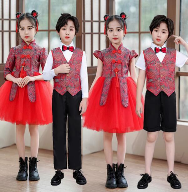 子供 ダンス衣装 女の子 中華ドレス チャイナ風ワンピース 男の子 シャツ ベストスーツセット 長袖 半袖 花柄 子供 学園祭 ダンス 合唱 コーラス 舞台 ステージ 衣装 100 110 120 130 140 150 160 170 赤