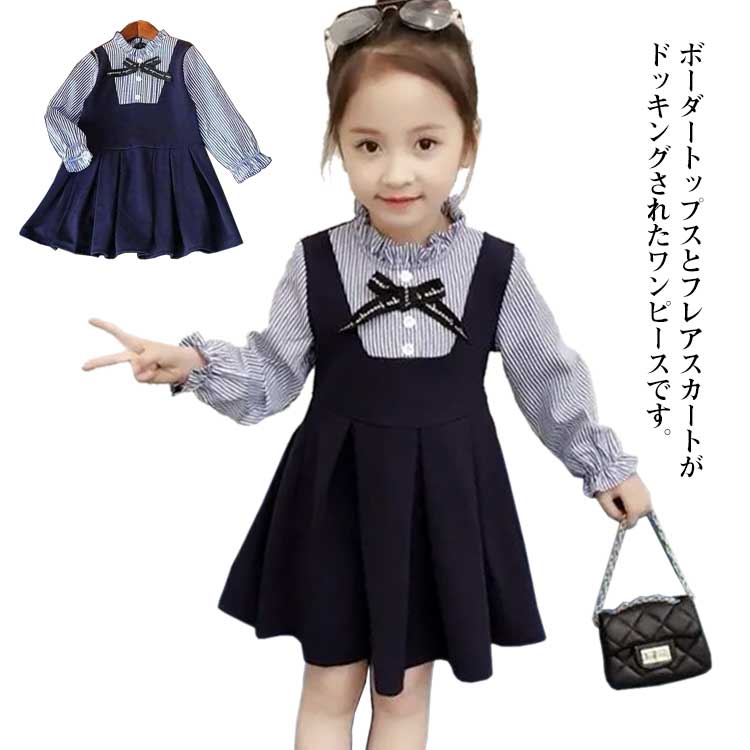 発表会 可愛い ワンピース ブラウスワンピース 入学式 こどもワンピ 長袖 膝丈 キッズ リボン 卒園式 ボーダー柄 保育所 保育園 レイヤード 子供服 入園式 退所式 ワンピース 90 100 110 120 130
