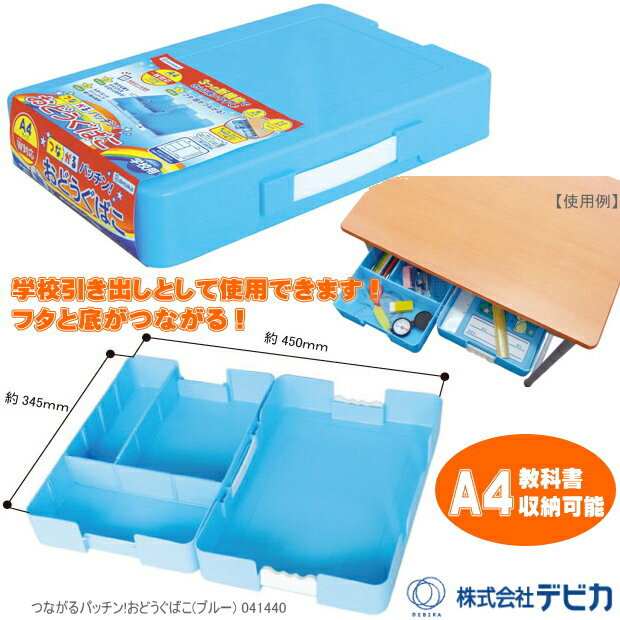 カンタン開け閉め、持ち運びに便利、A4W(ダブル)対応! ・フタと底がつながる!手さげを組み合す事で、 学校引き出しとして使用できます。 ・小物からA4の教科書までダブルで入ります。 ・開け閉めしやすいストッパーも大きくなりました。 ・持ち運び便利な手さげ付き。 ・取り付け位置を変えられる仕切り板2枚つき! ・環境に優しい再生プラスチックを使用。 ・有害ガスのでない安心素材(ダイオキシンカット) ・日本製 商品名 パッチンおどうぐばこ 青 品番 041440 ブルー サイズ 約)縦345×横233×高さ64mm 商品重量:約)520g(包装資材含む) 付属品 中仕切り(2枚)、なまえシール 材質 本体、ストッパー、トレー、仕切り板:再生プラスチック 手さげ:PE メーカー 株式会社 デビカ Debika ※他のモール及び店頭売りと在庫を併用しておりますのでご注文後でも在庫切れの場合がございますのであらかじめご了承下さい。 【関連商品】 小学一年生におすすめの かきかたえんぴつ イッポ 防犯ブザー ランドセル コクヨ まなびすと 下敷き ぱっちんお道具箱 黄色 濃いえんぴつ用消しゴム 服に穴が開かない名札留め具 キッズクリップ はし0 メモリ定規15cm ものさし 小学生 先生オススメ!連絡袋 A4対応 学童用品 学用品一覧はこちらをクリック