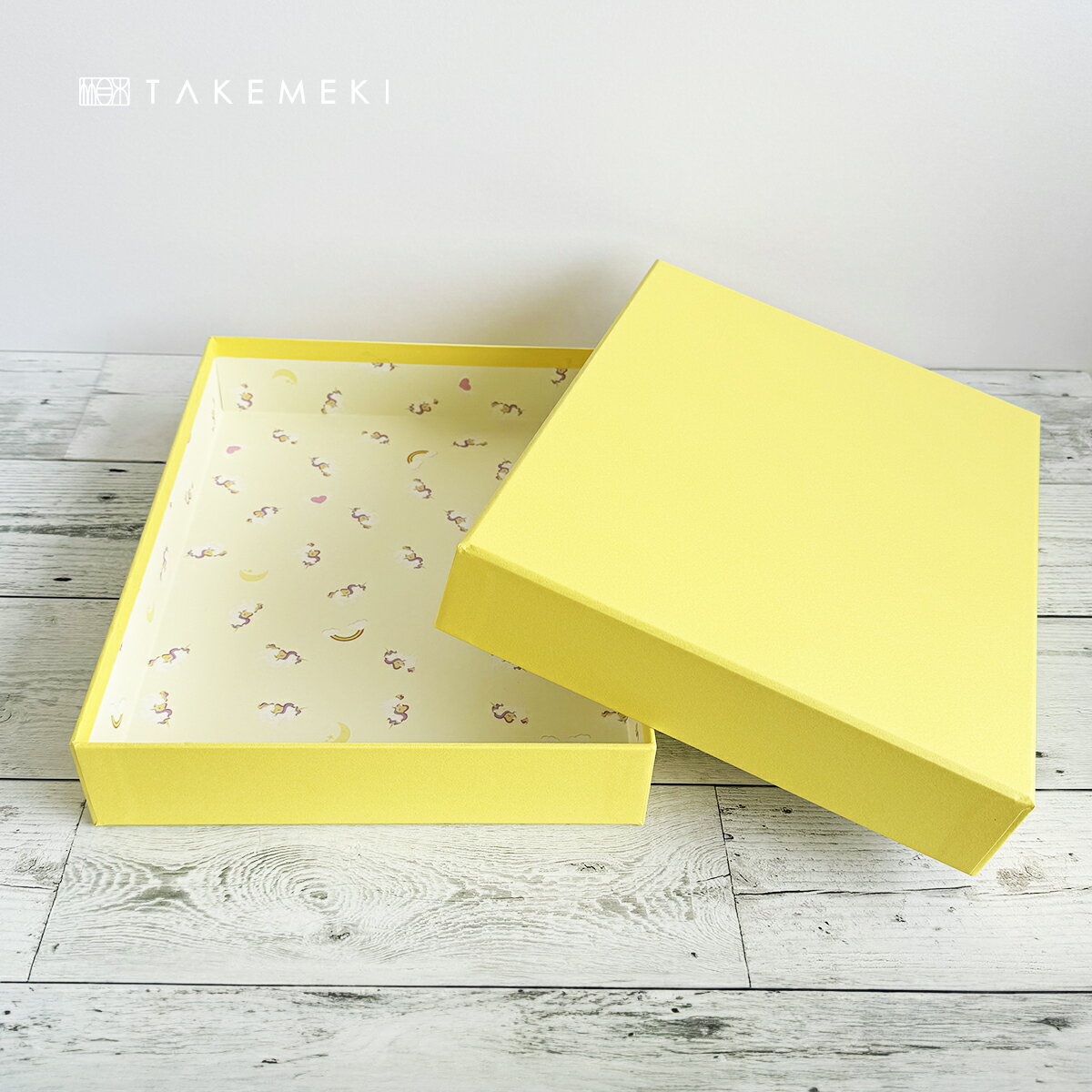 商品説明 サイズ (内寸)223×298×H50mm (外寸)236×312×H55mm ※図面サイズの表記となっておりますが、手作りの紙製品ですので、多少の誤差がある事をご了承下さい。 材質 芯材紙 色柄 ユニコーン (外側:パステルイエロー/内側:ユニコーン柄) ※お使いの環境によって、色・形・雰囲気が実物と違って見えることがございます。 ご理解いただける方のご購入をお願い申し上げます。 商品説明 貼箱製造の技術を生かした、カラフルなデザインと可愛らしい柄のKIDS BOXです。 TAKEMEKIで販売しているA4サイズのデスクボックスより少し小さめで、 学校やお家での整理整頓におすすめ◎ お色柄も4種類ございますので男女問わず、お選びいただけます。 お好きな場所に貼れるネームプレートも別添えで付属しているので仕分けにも便利です! 【注意事項】 この度「お道具箱」に取り付けておりますネームプレートを お客様がご自由に取り付けられる形でお届けすることにいたしました。 これに伴い、切り替え期間中は、取付済み・未取付の商品が 混在して出荷される場合がございます。 ご了承ください。 変更に関してご不明点がございましたら、お気軽にお問い合わせください。 ※商品のデザイン、仕様、外観、価格等は予告なく変更する場合や販売を中止する場合もございますのでご了承ください。 ※ご購入についてのお願い 「楽天ネットショップ」以外の通販サイト及び、 店頭(催事)でも掲載商品を販売させて頂いておりますので、 売り切れとなる場合がございます。その点をご了承いただいた上で注文ください。 ※大量購入も受け付けております。お気軽にご連絡下さい。