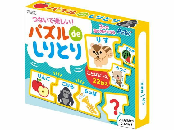 【重要:ご注文について】お客様のご都合による商品の交換・返品・数量変更は一切承っておりません。ご注文の際は慎重にお選びの上、ご注文願います。■ご注文の個数によっては、表示の出荷日目安よりも出荷まで日数を頂く場合がございます。納期については、事前にお問い合わせをお願い致します。また、当該商品は他店舗でも在庫を共有しておりますので、在庫更新のタイミングにより在庫切れの場合、やむを得ずキャンセルさせて頂く可能性があります。【送料について】『同梱区分C : 988円(沖縄・離島 2420円)』※『異なる同梱区分の商品』を一緒にご注文頂いた場合は、同梱が出来ません。別配送となり追加送料がかかりますので、ご注文後に訂正の上、ご連絡させて頂きます。【ご注意】事前の配達日付は一切ご指定頂けません。配達日時につきましては、お手数ですが出荷完了時にご案内する荷物問い合わせ番号をもとに、お客様より配送業者へ直接御調整をお願い致します。メーカーによるリニューアルに伴い、パッケージ・内容等が予告なく変更される場合がございます。掲載写真等がリニューアル前のものであっても、リニューアル後の商品が届いた場合、ご返品や交換等は承ることが出来ません。置き配は破損・汚損・紛失・盗難などの恐れがあるため、原則としてお断りしております。置き配による破損・汚損・紛失・盗難については保証ができかねますので、あらかじめご承知おきください。パズルdeしりとり アーテック 6705ピースをはめてしりとりを完成させよう!●内容:本体×1●商品サイズ:カード(最大):50×55mm、箱:115×95×20mm●材質:紙※メーカーの都合により、パッケージ・仕様等は予告なく変更になる場合がございます。●広告文責:株式会社プロヴィジョン(tel:092-985-3973)