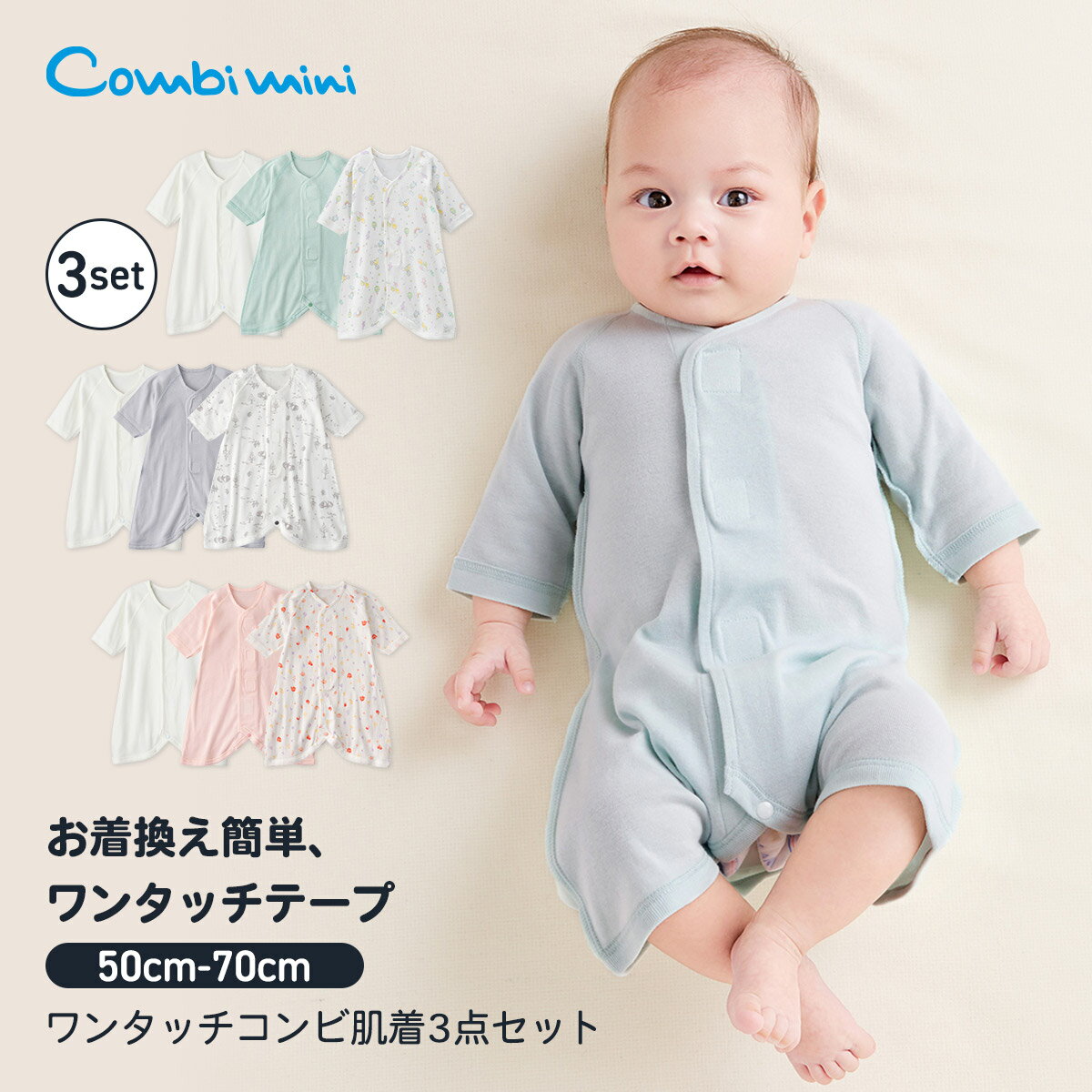モデル身長:62cm 着用サイズ:50~60 モデル身長:60cm 着用サイズ:60~70 商品について 【素材】毎日洗濯する肌着は赤ちゃんが快適に着れるように伸縮性がある肌ざわりの良い綿100%フライス生地を使用。 【カラー】洗い替え用に色違いで揃えたくなるキレイめなカラーのワンタッチコンビ肌着です。ナチュラルな雰囲気もあり、ベビーギフトにもおススメです。 【仕様】「もっとかんたんにお着替えしたい」というママたちの声に応えて、ワンタッチテープ式のコンビ肌着が登場。足をバタつかせてもはだけない股下プランサー付きで、ワンタッチテープをさっとなでるだけで、素早くお着替えできます。内股中央のボタンは手ざわりと色を変えて、掛け違いを防止します。洗い替えが可能なお得な3枚組みセットでご用意。無地のコンビ肌着に、カラー無地と可愛らしい総柄プリントのミントグリーン&どうぶつ柄、ライトグレー&はりねずみ柄、ピンク&花柄を組み合わせた、新米ママ&パパにうれしいコンビ肌着3枚セット。出産準備におすすめです。 【伸縮性】あり 【透け感】透けない 【クリーニング】洗濯機洗い可(他の衣服にテープ部分がくっついてしまう恐れがあるため、テープ部分を止めてからお洗濯してください。) 【裏地】なし モニター・環境等により実際の商品と色味が多少異なって表示される場合がございます。 また、生産時期により色味が若干異なる場合がございます。予めご了承ください。 素材について 綿100%(フライス) 備考 外縫い仕様、掛け違い防止ボタン付き カラー展開 ミントグリーン、ライトグレー、ピンク サイズ展開 50〜60、60〜70 サイズについて 50〜60身幅23.5cm/着丈43cm/裄丈24.5cm60〜70身幅25.5cm/着丈48.5cm/裄丈26cmベビー服サイズの選び方 >> ブランドについて Combiminiベビー服は、大切な赤ちゃんが初めてみにつけるものだから。コンビミニは「本当にいいもの」を身につける喜びをベビーとママ、パパにお届けしたいと願っております。長年赤ちゃんを見つめてきたベビー用品総合メーカーとして、培ってきた「赤ちゃん工学」をフル活用し、着ごこち、動きやすさ、着せやすさなど、あらゆる面にこだわりを一つ一つ丁寧に仕上げています。ベビーがたくさん笑ってくれるような服を、これからもお届けします。 ギフトラッピングをご希望の方 >>