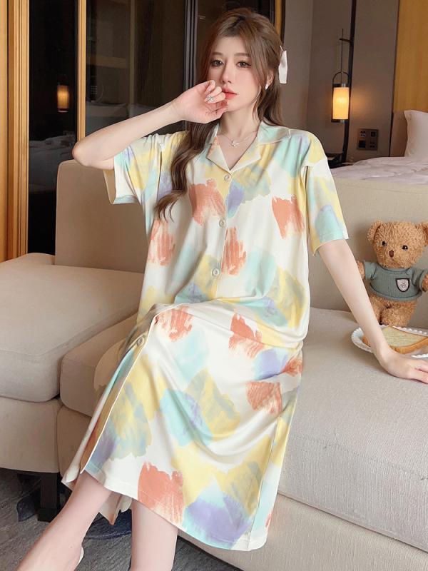 授乳パジャマ 春夏 半袖 ロングスカート Vネック 襟付き 花柄 マタニティ ルームウェア オレンジ ホワイト ブルー ピンク ゆったり