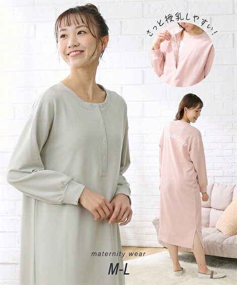 マタニティ パジャマ ルームウェア ママ ウェア 授乳服 バック ロゴ裏毛ルーム ワンピース 産前 産後 出産準備 ピンクオレンジ/ライトグリーン M/L ニッセン nissen