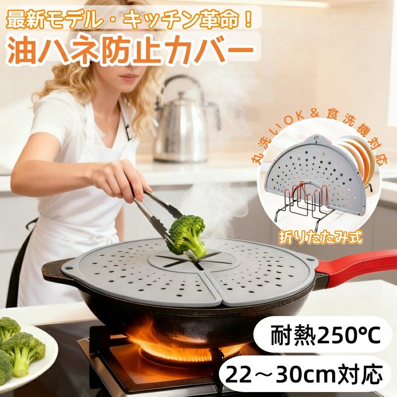 油ハネ対策はこれ1枚!折りたたみ式 多機能シリコンカバー揚げ物や炒め物の油ハネをしっかりガード。さらに折りたたんで油切りトレーとしても使える、便利な2WAY仕様。商品ポイント油ハネ防止微細メッシュ構造で油の飛び散りをしっかりガードし、キッチン周りの汚れを軽減します。蒸気逃し設計中央スリット構造により蒸気を逃がし、食材のサクッとした仕上がりをキープ。折りたたみ式中央ヒンジ設計で簡単に折りたたみ可能。省スペース収納にも便利です。2WAY仕様カバーとしてだけでなく、揚げ物の油切りトレーとしても使用可能。調理中も便利中央の隙間からハンドミキサー使用可能。ホイップ時の飛び散り防止にも活躍。安全素材食品グレードのプラチナシリコンを採用。BPAフリーで安心してご使用いただけます。お手入れ簡単丸洗いOK&食洗機対応。汚れが付きにくくお手入れも簡単です。商品詳細商品名折りたたみ式 油ハネ防止カバーサイズ(展開時)直径 約35.5cm(20~30cmの鍋フライパン対応)サイズ(折りたたみ時)約32cm × 17cm厚さ約0.6cm(折りたたみ時:約1.2cm)重量約240g素材食品グレード プラチナシリコン(BPAフリー)耐熱温度-40~250お手入れ食洗機対応 / 丸洗いOK使用シーン揚げ物(唐揚げ天ぷらなど)炒め物(油ハネ防止)ホイップ(飛び散り防止)キッチンの油汚れ対策油切りトレーとしても使用可能ご注意事項調理直後は本体が高温になりますので、十分に冷ましてからお取り扱いください。本製品は油ハネを軽減するものであり、完全に防ぐものではございません。直火に直接当てたり、本品単体での加熱はお避けください。鍋フライパンの形状によりフィット感が異なる場合がございます。火力が強すぎる場合、シリコン部分が熱の影響を受ける可能性がございます。初回使用前は中性洗剤で洗浄してください。漂白剤研磨剤金属たわしの使用はお控えください。モニター環境により色味が異なる場合がございます。製造工程上、若干の個体差が生じる場合がございます。油ハネ防止 カバー シリコンカバー 揚げ物カバー 油はねガード キッチン用品 折りたたみカバー 油切りトレー 飛び散り防止 フライパンカバー 調理カバー 耐熱シリコン キッチン便利グッズ油ハネ対策はこれ1枚!折りたたみ式 多機能シリコンカバー揚げ物や炒め物の油ハネをしっかりガード。さらに折りたたんで油切りトレーとしても使える、便利な2WAY仕様。商品ポイント油ハネ防止微細メッシュ構造で油の飛び散りをしっかりガードし、キッチン周りの汚れを軽減します。蒸気逃し設計中央スリット構造により蒸気を逃がし、食材のサクッとした仕上がりをキープ。折りたたみ式中央ヒンジ設計で簡単に折りたたみ可能。省スペース収納にも便利です。2WAY仕様カバーとしてだけでなく、揚げ物の油切りトレーとしても使用可能。調理中も便利中央の隙間からハンドミキサー使用可能。ホイップ時の飛び散り防止にも活躍。安全素材食品グレードのプラチナシリコンを採用。BPAフリーで安心してご使用いただけます。お手入れ簡単丸洗いOK&食洗機対応。汚れが付きにくくお手入れも簡単です。商品詳細商品名折りたたみ式 油ハネ防止カバーサイズ(展開時)直径 約35.5cm(20~30cmの鍋フライパン対応)サイズ(折りたたみ時)約32cm × 17cm厚さ約0.6cm(折りたたみ時:約1.2cm)重量約240g素材食品グレード プラチナシリコン(BPAフリー)耐熱温度-40~250お手入れ食洗機対応 / 丸洗いOK使用シーン揚げ物(唐揚げ天ぷらなど)炒め物(油ハネ防止)ホイップ(飛び散り防止)キッチンの油汚れ対策油切りトレーとしても使用可能ご注意事項調理直後は本体が高温になりますので、十分に冷ましてからお取り扱いください。本製品は油ハネを軽減するものであり、完全に防ぐものではございません。直火に直接当てたり、本品単体での加熱はお避けください。鍋フライパンの形状によりフィット感が異なる場合がございます。火力が強すぎる場合、シリコン部分が熱の影響を受ける可能性がございます。初回使用前は中性洗剤で洗浄してください。漂白剤研磨剤金属たわしの使用はお控えください。モニター環境により色味が異なる場合がございます。製造工程上、若干の個体差が生じる場合がございます。油ハネ防止 カバー シリコンカバー 揚げ物カバー 油はねガード キッチン用品 折りたたみカバー 油切りトレー 飛び散り防止 フライパンカバー 調理カバー 耐熱シリコン キッチン便利グッズ