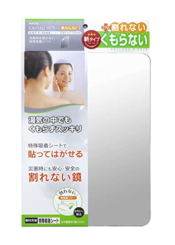 パネルミラーミラー/長さ29.5 x 幅21.6 cm/FAP-772・PatternName:295×215×2 パネルミラー 特殊吸着シートタイプ・パッケージ個数:1・くもり止め効果は約1年ですが、湿度や汚れの多い所では早く効果がなくなることがあります。・本体サイズ:縦295×横215×厚み2・材質・素材:(ミラー)PETフィルム (本体)スチロール樹脂 (吸着シート)ターポリン基材、アクリル系吸着材・製造国:日本・取付方法:特殊吸着シート(裏面全面)●浴室でも快適に安心してご使用いただく為、鏡表面にくもり止め加工を施した、軽くて割れない樹脂製ミラーです。 ●くもり止め効果は約1年ですが、湿度や汚れの多い所では早く効果がなくなる事があります。 ●鏡表面に水膜を作る事により、くもり止め効果を発揮しますので、くもり止め効果を感じられない時は、鏡表面を濡らしてください。 ●鏡が汚れると、くもり止め効果は低下します。この場合は石けんや中性洗剤を柔らかいスポンジや指先につけて軽く洗浄して水で洗い流してください。 ●吸着シート面はベタベタしていますが粘着剤ではございません。 ●吸着シートにほこりや汚れが付いた場合は、吸着力が弱くなるため、水洗いして、よく乾かしてから取り付けてください。 ●ツヤ消し、小さな凹凸面でも取り付けられます。(タイル面、プラスチック面(ユニットバスなど)、金属塗装面、ステンレス面、ガラス面、化粧合板、壁紙(塩化ビニール製)など。 ●樹脂製ミラーのため貼り付け面や貼り付け時の押さえ方で歪んで見える事があります。