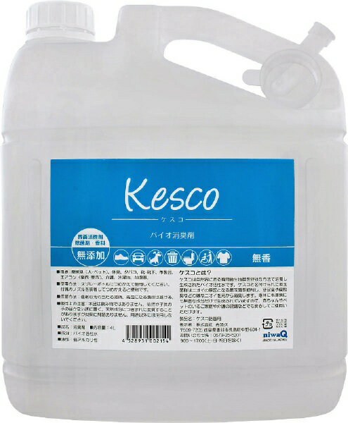 ケスコは自然界にある環境微生物群を特殊な方法で培養し生成された善玉活性水です。ケスコと名付けられた善玉菌群はニオイの原因となる悪玉菌を抑制し、便尿臭や腐敗臭などの嫌なニオイを元から消臭します。身体にも環境にも無害な成分だけで生成されていますので、赤ちゃんやペットのいるご家庭や介護の現場などでも安心してお使いいただけます。<用途>●便尿臭(人・ペット)、タバコ、靴・靴下、布製品、加齢臭、洗濯物、エアコン(室内・社内)、加湿器。<使用方法>●必ず「ケスコ」のスプレー容器につめかえてください。●付属のノズルを装着して詰め替えると便利です。