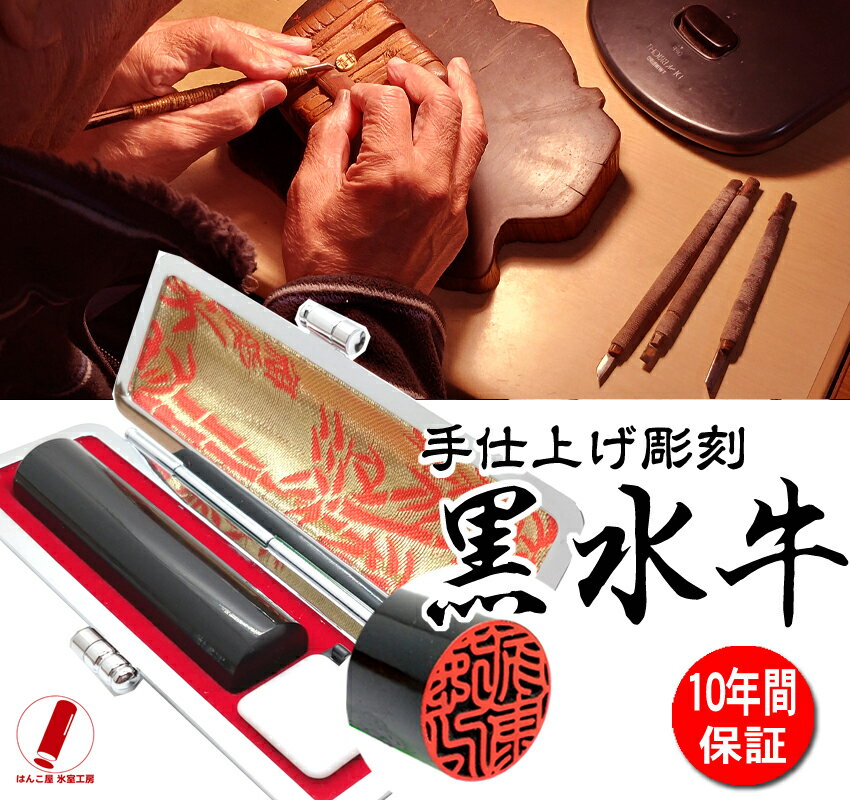 黒水牛印鑑 高級もみ皮印鑑ケース付【送料無料】 黒水牛芯持は、耐久性・硬度・粘りにも優れ、篆刻には大変に適した材質です。芯に最も近い部分で、この芯もち部分を使用した黒水牛印鑑は最高級と言われています。 ●ケース 高級もみ皮印鑑ケースをお付けします。 ●サイズ 10.5〜15.0ミリまでのお好きなサイズをお選び頂けます。 ※おすすめサイズ 女性 実印13.5mm 銀行印12.0mm 男性 実印15.0mm 銀行印13.5mm ●文字の配置 フルネーム(10.5/12.0mmは除く)/ 姓 / 名 彫刻可能。 ●保証 安心の10年保証付き ●配送 定形外郵便のポスト投函でのお届けとなります。 別途料金にて、宅配便配送に変更可能です。 ハンコヤストアでは個人印鑑から法人印鑑まで多数取り揃えております。この他にも印鑑ケースセット・おしゃれな印鑑ケース・各種印鑑2本/3本セットもお求め易い価格でご提供させて頂いております。実印・銀行印・認印はもちろんネーム印・ゴム印・浸透印・会社設立まで当店にお任せ下さい。もちろん全商品送料無料でお届けいたします。 当店の人気ランキング1位黒水牛 2位オランダ水牛 3位上柘 4位彩樺 5位琥珀です。是非ご参考にして下さい。見た目だけではなく、捺印性能も抜群の逸品
