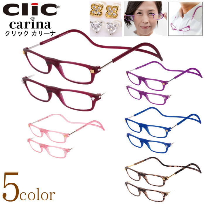 老眼鏡 正規品 クリックリーダー クリックカリーナ CliC readers carina 磁石 首掛け おしゃれ シニアグラス リーディンググラス ピアス状の飾りパーツ付 女性用 マグネット 開閉式 読書用メガネ 辞書 新聞 40代 50代 母の日 敬老の日 贈り物[選べる5色]