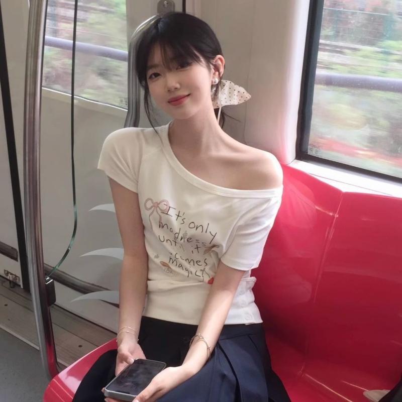 Tシャツ レディース 韓国ファッション インス風 Y2K ワンショルダー 肩出し グラフィティプリント 裾スリット 半袖 スリムフィット 細見え 旬顔 甘辛 ストリート トップス カットソー ホワイト
