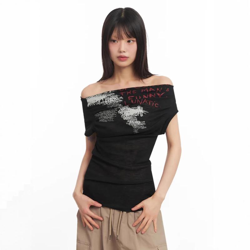 Tシャツ レディース 半袖 オフショルダー Y2Kファッション グラフィティ プリント デザイン トップス ストリート系 パンク カジュアル バイカラー スリムフィット タイトシルエット 肩見せ ポリエステル ニット素材 ブラック ホワイト
