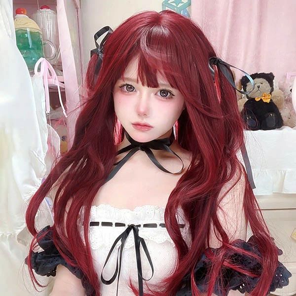 ウィッグ レディース フルウィッグ ロング ストレート 赤髪 ワインレッド ぱっつん前髪 前髪あり 可愛い かわいい 大人用 コスプレ ロリータ ゴスロリ コスチューム 原宿風 仮装 超自然 かつら wig Lolita 小顔 文化祭 イベント 学園祭 ハロウィン