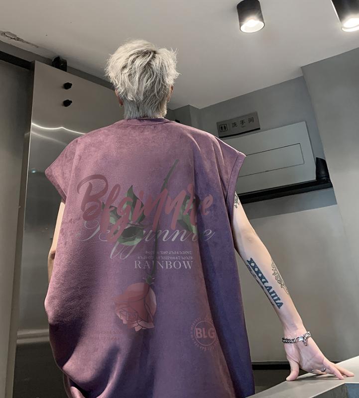 おしゃれ 夏 レトロ アメリカン ヘビー シャツ トップス ブラック T ヒップホップ パープル ノースリーブ ストリート メンズ スエード