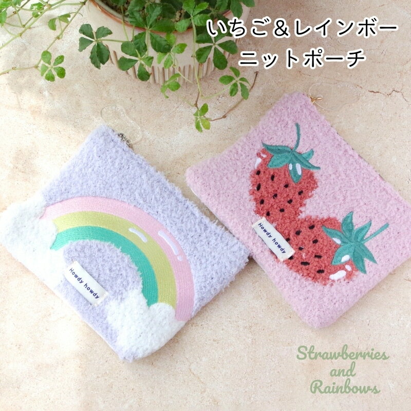 【フラットポーチ レディース】ふわふわ ニット 刺繍 パステルカラー いちご レインボー 可愛い おしゃれ コスメポーチ メイクポーチ 文房具 ガジェット 収納 プレゼント ギフトFlowering GPO0377