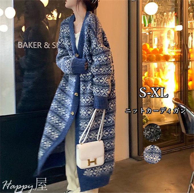 ニットカーディガン レディース Vネック ロングカーディガン ニット プリント アウター 長袖 シングル 厚手 羽織り ライトアウター 柔らかい 韓国ファッション 秋冬 送料無料