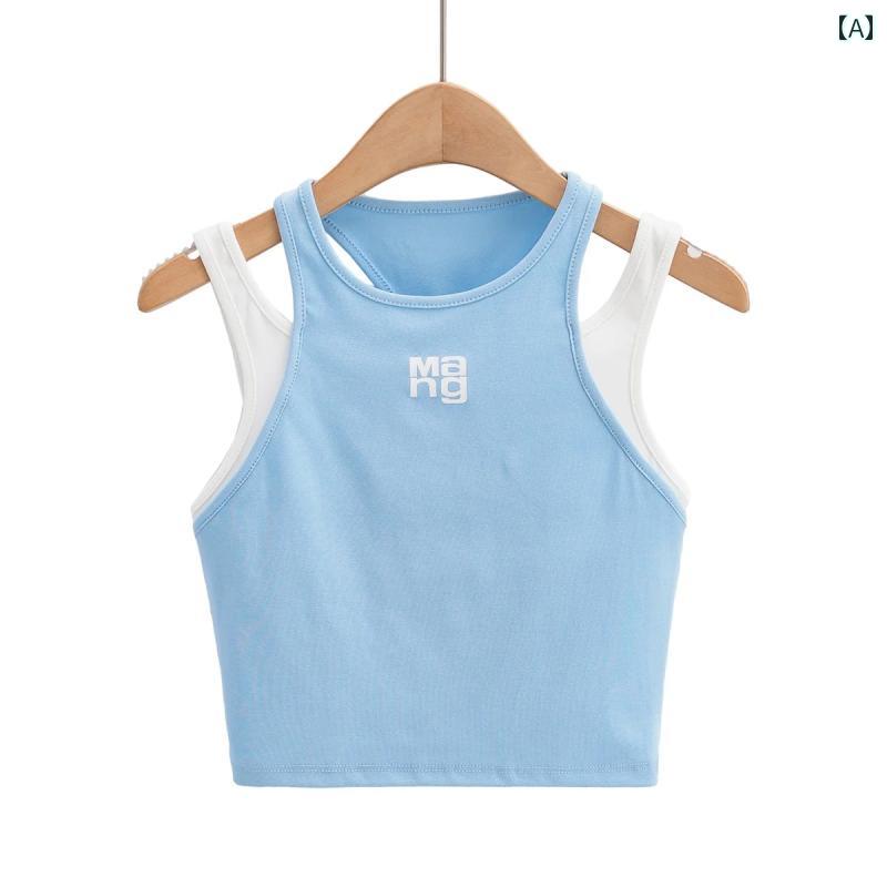 レディース ファッション アメリカ レトロ コントラスト レター プリント フェイク ツーピース ショート ベスト ラウンドネック スリムフィット ハイウエスト クロップ トップス